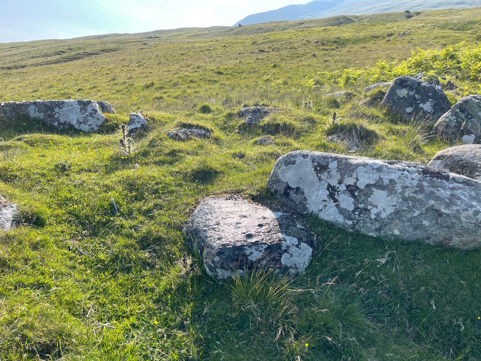 “A small mound, apparently the remains of a cairn, was excavated on the farm of Glencreggan by Mr and Mrs J.G. Scott. The mound was roughly oval in shape, about 20 feet by 14 feet in size, and about 2 feet in height, with its longer axis lying almost E-W. A large stone slab, about 8 by 3 feet in size, lay against its N corner.