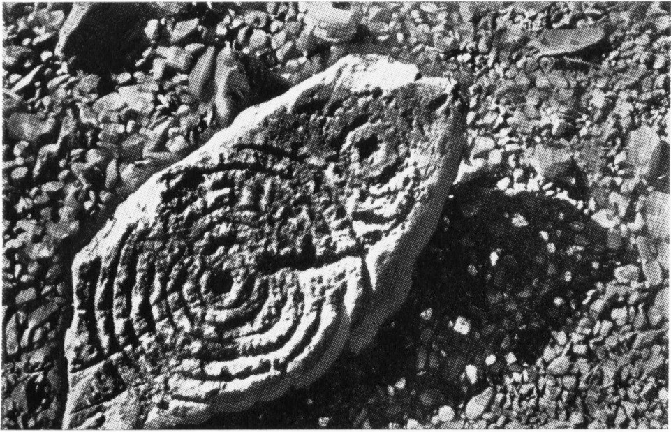 “Rock outcrop with two cup-marks, on August 6th 1960 this outcrop was intact. On a second visit the top layer of the rock had become detached and split into two. The pieces were then removed for preservation.”