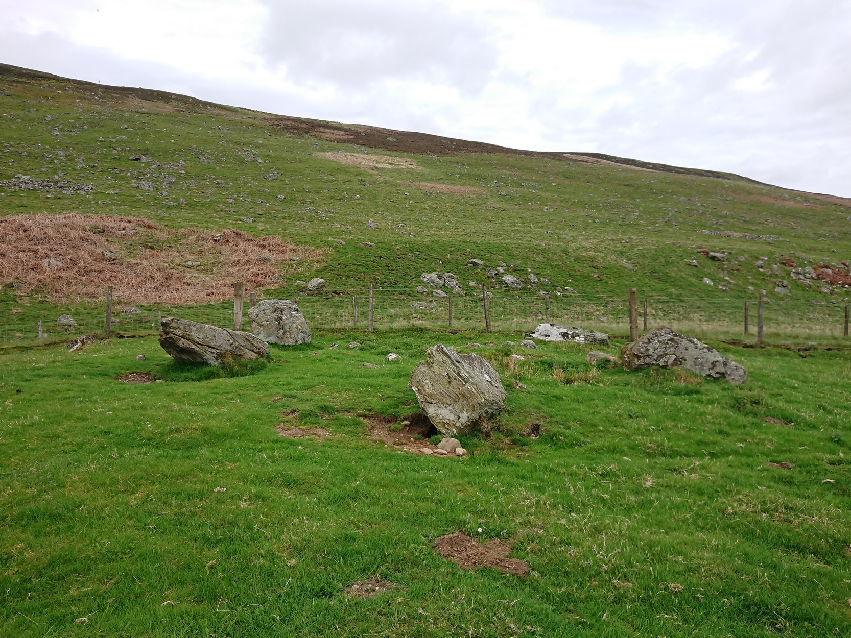On the other side of the long natural crack is a haphazard spread of nine more cup-marks, with at least one of them seeming to possess a very faint incomplete ring around it. You can just make it out in one of the attached photos. From some angles it seems that two other cups may possess fragments of carved rings around them, but more visits are needed in better light before we can say this with any certainty. One of the cups in this cluster is elongated, whilst two other cups in this bunch are conjoined. Another crack to the side of this secondary cluster has one or two more cups cut into it. Altogether we have between 19 and 21 cups on this petroglyph, with rings around several of them. Worth checking out when you visit this neck o’ the woods. And, of course, if you’re a serious rock art researcher, scan the slopes hereby as other carvings yet remain hidden. You can almost feel them breathing…..