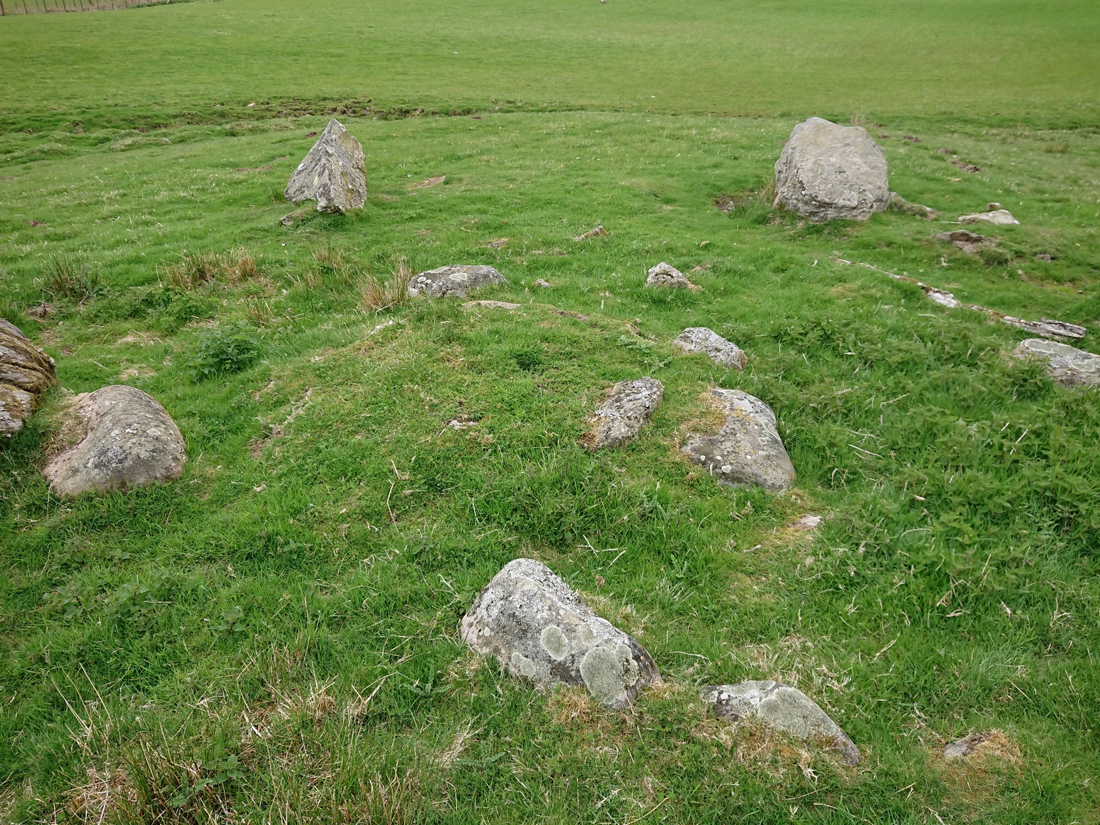 As we can see quite clearly in the photos here, two of the cups possess rings around them. One of the cup-and-rings near the middle of the mass of cups is complete, with a short line running out of it and into the longest of the natural cracks that frame the design and that runs all the way across the surface of the stone. This cup-and-ring plays a part in a rough circle of cup-marks surrounding a central cup, with one of the outer cups possessing a companion just outside the ring. Two cups in this circle are elongated. There is a possibility that the cup-and-ring I’ve mentioned has another line running from it into the cupmark at the centre of the circle.