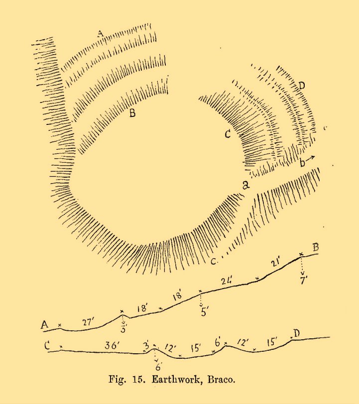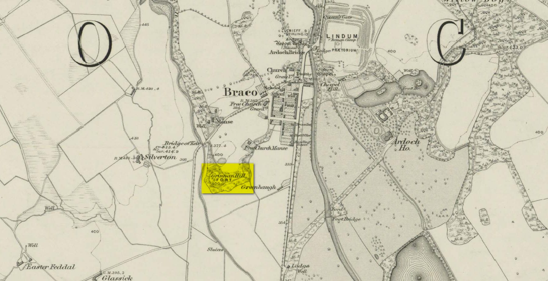 “Near the parish church is an eminence called Grianan Hill, on which are still to be traced the remains of a British fort.  The hill is a beautifully wooded knoll to the west of the village of Braco.  It appears to be about 100 feet in height above the level of the surrounding land; on three of its sides the ground is perfectly flat, and we could suppose that in the amply days of the fort above, it had been environed on three sides by a lake, which would of course contribute to its strength.  The fourth side of the hill, having but little natural strength, has been strongly fortified by three great walls.  This is the side which connects the knoll with the neighbouring rising ground which is nearly as high as itself.