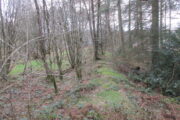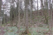What he failed to point out—and contrary to Canmore’s comment that “the interior is featureless”—is the length of internal walling running nearly halfway through the top of the hillfort, cutting it in half so to speak, roughly southeast to northwest: the eastern area slightly larger than the west, which is a little higher.  A ‘gate’ or passage between these two sides seems apparent halfway along this line of walling.  This wall, like the long one running along its southern edge, is a couple of feet high and more than a yard across.  In the western section a small pit has been dug, about eight feet across and a yard or so deep.  Local lore tells that this was an old Roman fire-pit!