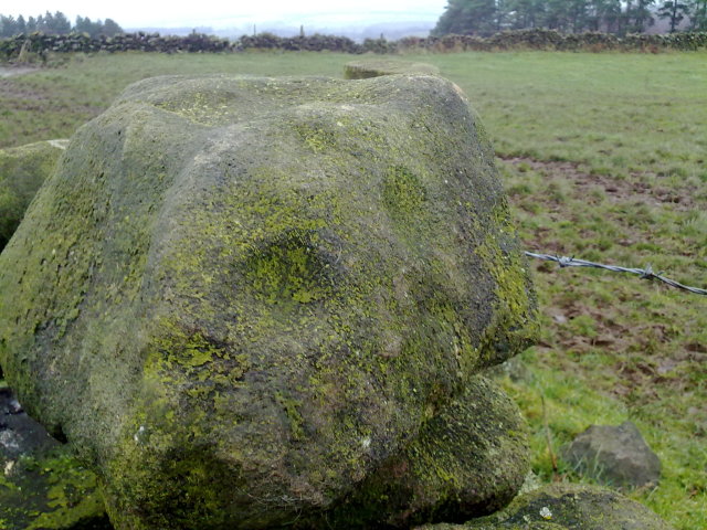 This small carved stone, typical of the size you get in drystone walls all over the country, was discovered for the first time on November 29, 2009, by Geoff Watson, during an ambling foray exploring the megalithic sites in and around the Birchover district. Not quite sure how his nose picked this little fella out, but once seen (and eyes adjusted!) it was obviously a portable cup-marked stone. Though what, we first wondered, was it doing in the walling here?