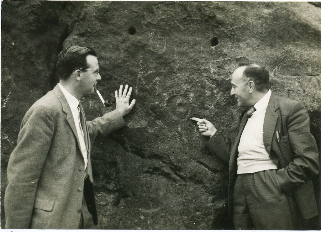 This singular cup-and-ring design seems to have been reported first in E.S. Wood’s (1952) lengthy essay on the prehistory of Nidderdale. It was visited subsequently by the lads from Bradford’s Cartwight Hall Archaeology Group a few years later; and in the old photo here (right) you can see our northern petroglyph explorer Stuart Feather (with the pipe) and Joe Davis looking at the design. In more recent times, Boughey & Vickerman (2003) added it in their survey of, telling briefly as usual: