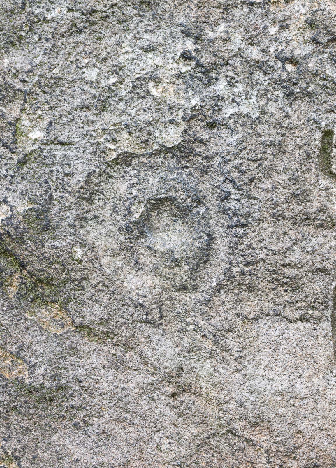 “On sheltered E face of main crag above a cut-out hollow like a doorway is a cup with a ring; the top surface of the rock is very weathered and may have had carvings, including a cupless ring.”