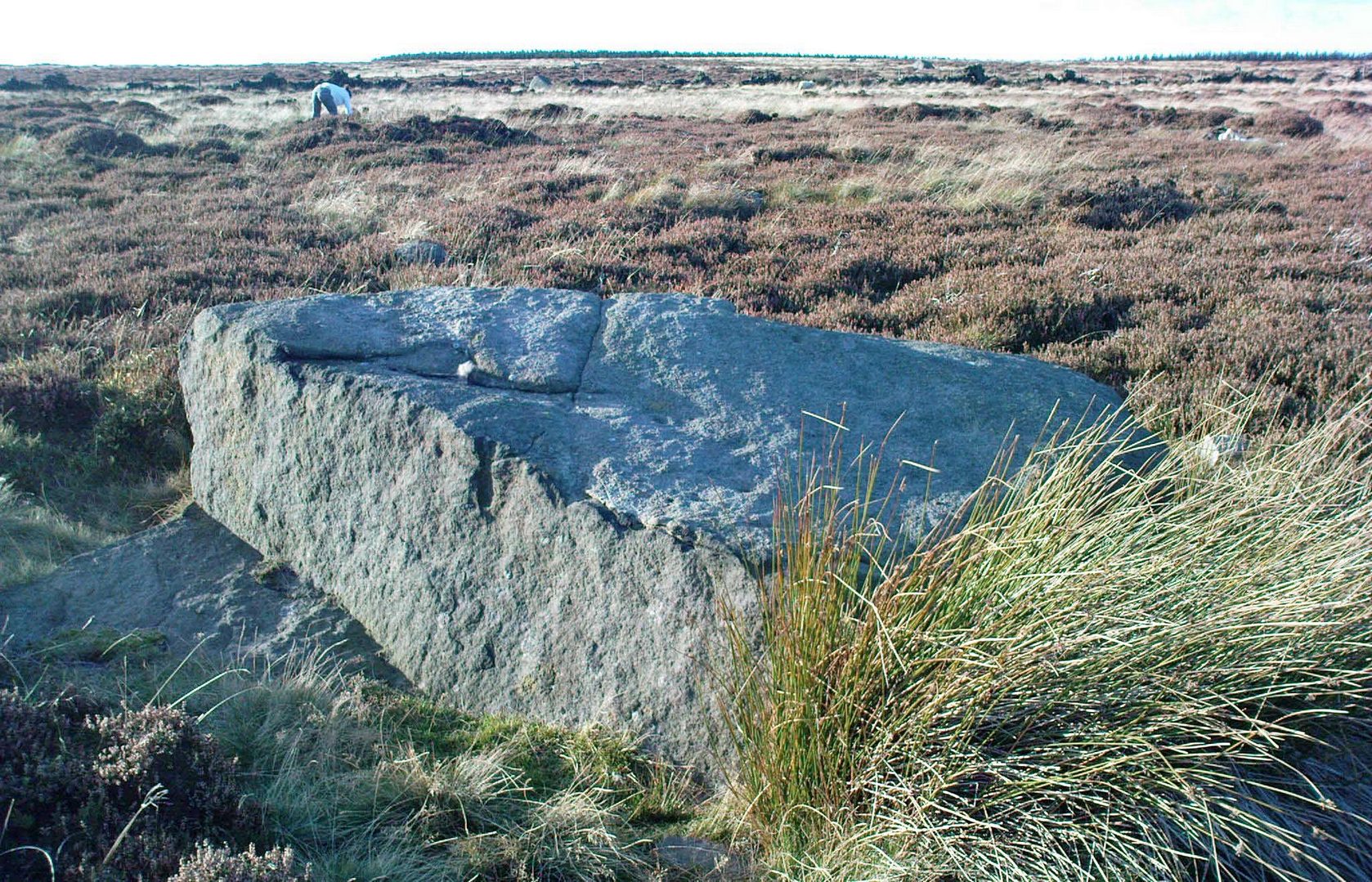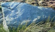 “lying almost immediately on the east side of Cist 1 is an angular rock…measuring 1m long and over 0.3m wide on the uppermost face, itself lying at an angle facing SW and away from the cist. The rock has fractured due to weathering in post deposition times, as indeed several other surface stones had, but on the widest part of the upper surface are at least seven concentric lines faintly pecked into the smooth flat surface of the stone. The lines are up to 10mm wide and appear to have been intended to form semi ovals on the edge of the rock. The outer ring forms an arc of c270mm on the long axis by c140mm on the short one (the former measurement being straight between the ends of the lines and the latter being a radius across the design). The terminals of the inner curved line are about 80mm apart. The lines are slightly irregular in distance from one another. Although it is far from certain, it does not appear that the rock has been part of a larger one with a more complete design on it, rather the pecking appears not to have been finished since the surface of the rock is similar in appearance overall while the abrasion of the carving varies.”