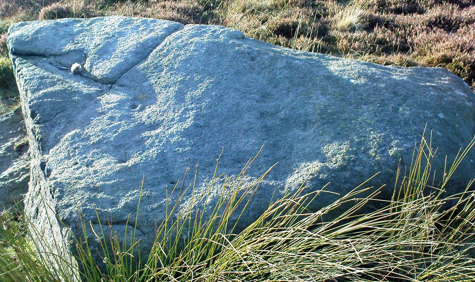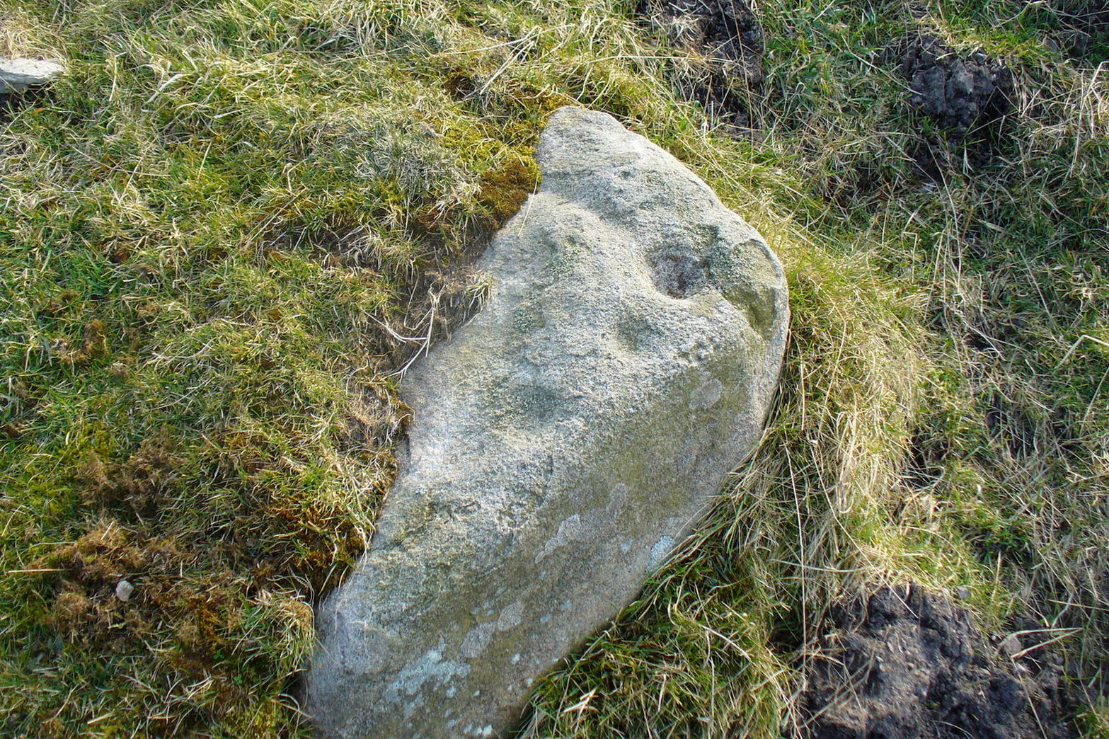 “SE-facing slope, 1.2m long pointed rock aligned E-W; three shallow cups, 30-40 x 6-10mm.”