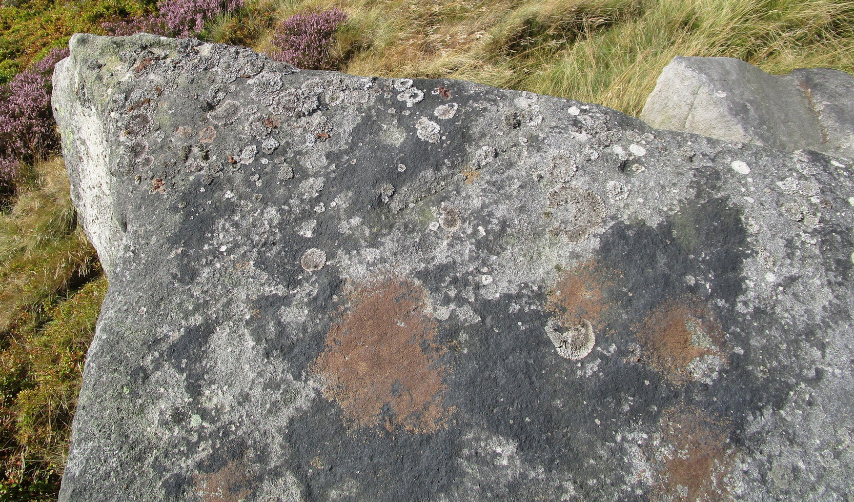 It’s nowt special to look at in all honesty, but it’s in a good state of preservation as it was seemingly uncovered in pretty recent times beneath the curious large mass of loose stones right next to it. The stone mass gives the impression of it being a ruined cairn, but seems more likely to be a clearance cairn that was piled up, quite fortuitously, next to the cup-marked rock.