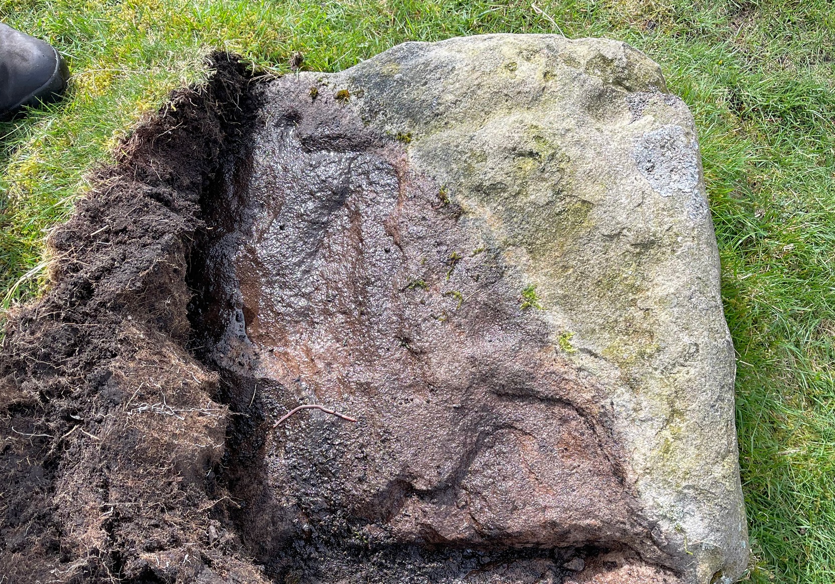 When I got to this stone, the evening sun was literally touching the horizon and so the light cutting across half the rock highlighted very little indeed. I was rushing, trying to fondle and see as much as I could before the darkening sky clouded everything, and as I almost frenetically sprayed showers of water across its surface, the two or three cups that I could see near the crown of the stone suddenly doubled in number. Two cups along one edge became three; whilst the sloping surface above these that had one cup suddenly seemed to have a companion. On the highest part of this gently sloping stone, the form of one of the two distinct cup-marks that first caught my eye seemed to slowly morph into one of the carved “footprint” designs, akin to those clustered on the Ardoch (2) carving 1½ miles south-west of here. However, this element needs looking at again, as it may have been a curious playful trick between stone and light showing me something that wasn’t there! Things like that happen with stones.