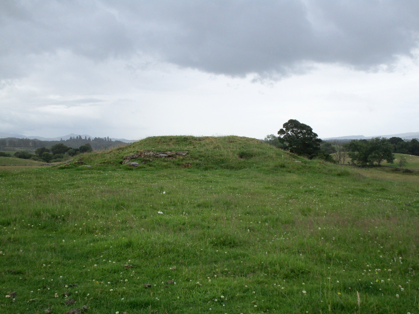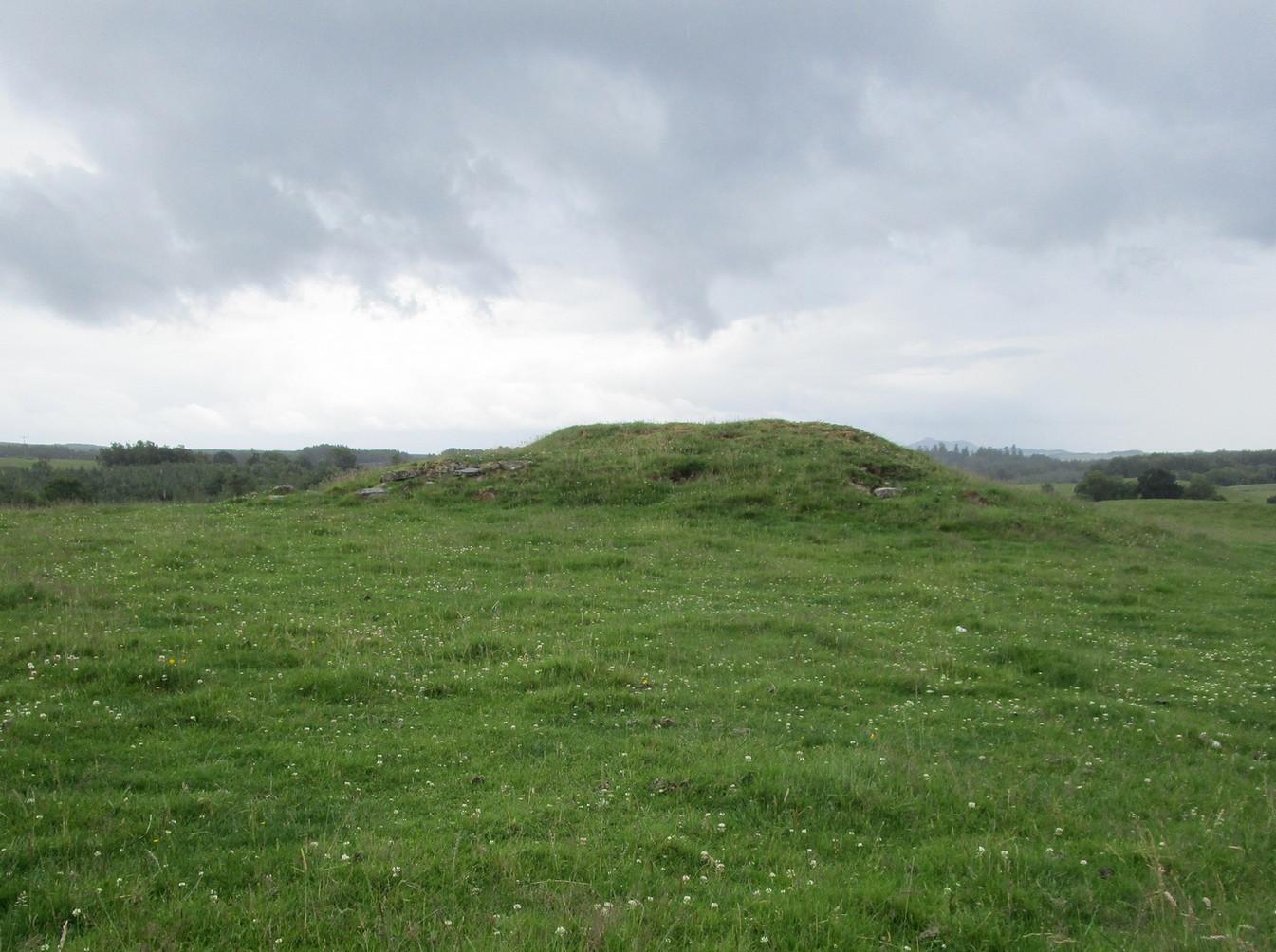 From Callander head east along the main A84 road and nearly 300 yards past the entrance to the Keltie Bridge caravan park, take the tiny road on your left (north) and barely 100 yards along turn right and go up here for exactly 1 mile. Walk up the track from here and follow the directions to find the Black Park (1) cairn; and then the nearby small Black Park (2) cairn. From here you need to walk north-east round the small rounded hillock in front of you, and cross a small burn (stream) up to the next small grassy rise. Altogether this is about 200 yards from the Black Park (2) cairn. On this grassy rise lives the Black Park (3) cairn!