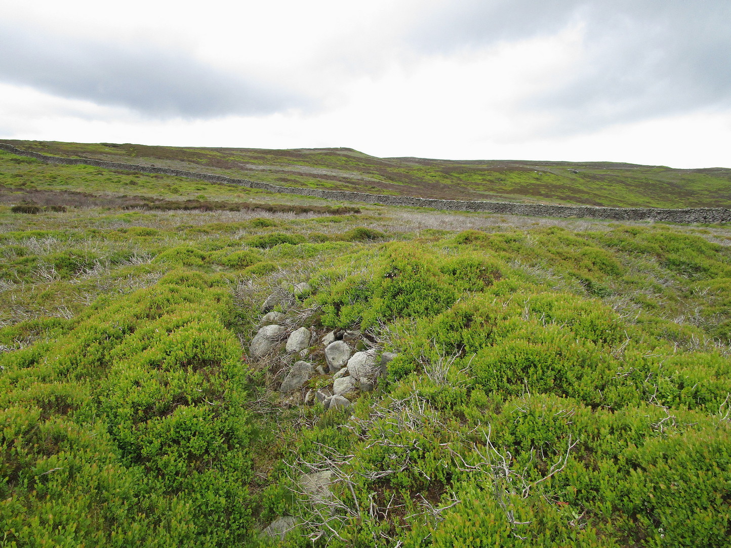 It’s easier to explain how to get here if you’re coming from the Burnsall-side of the B6160 road that leads to Bolton Abbey. A half-mile out of Burnsall village you a small woodland with a small parking spot. From here, a footpath runs up the steep hill above the parking spot. It zigzags a little and you eventually come out on the south-side of the trees where it meets some tall walling. Follow this walling further uphill for more than 600 yards (past more woodland) until the land starts to level out. Hereby, go thru an opening in the wall and less than 100 yards away (west) amidst the overgrown heather, you’ll see what you’re looking for.