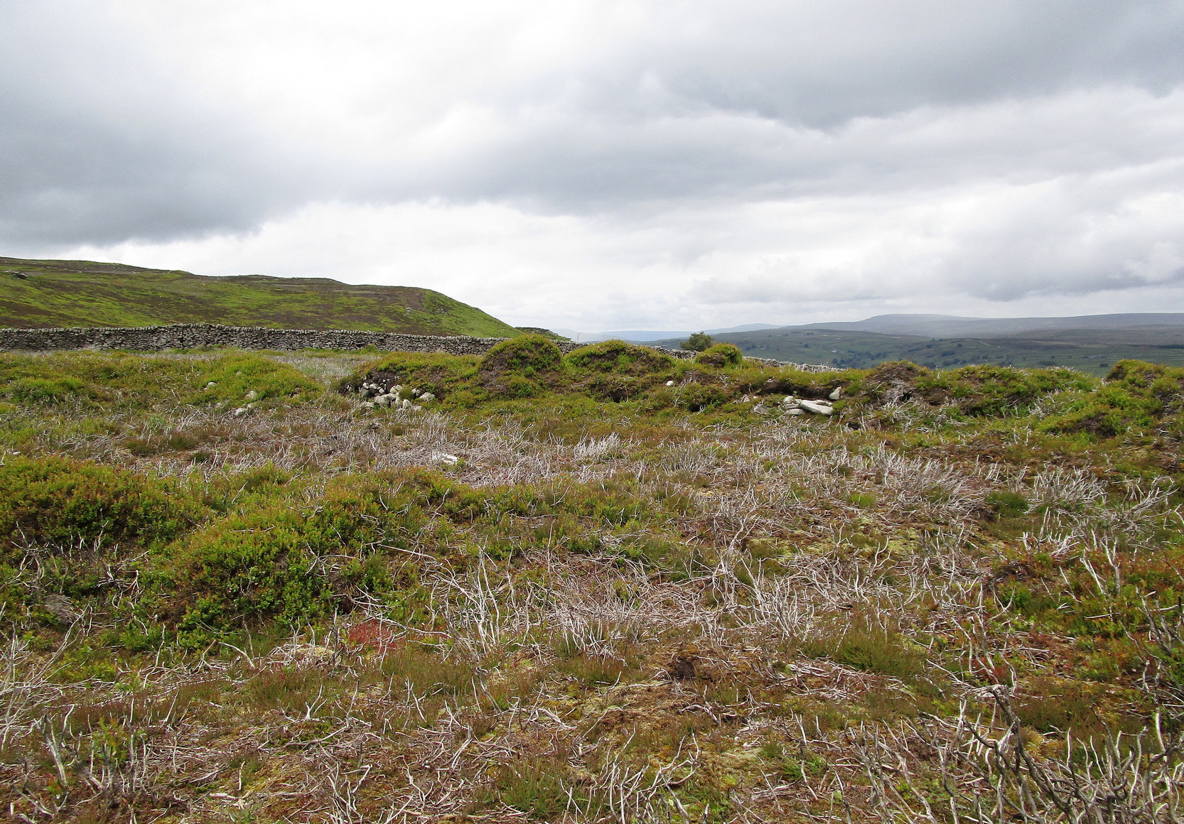 The site consists of large ring of raised collapsed rubble walling, more than a yard high in places, and about three yards thick all the way round, measuring roughly 21 yards (N-S) by 19 yards (E-W) from outer wall to outer wall. There are “entrances” on the east and west sides; but there seemed to be little of any note in the middle of the ring, although the site was somewhat overgrown on our visit here. Outside of the ring there was also nothing of any note. It’s a pretty isolated monument which seems to have more of an Iron Age look about it than the Bronze Age—but until there’s an excavation, we’ll not know for sure.