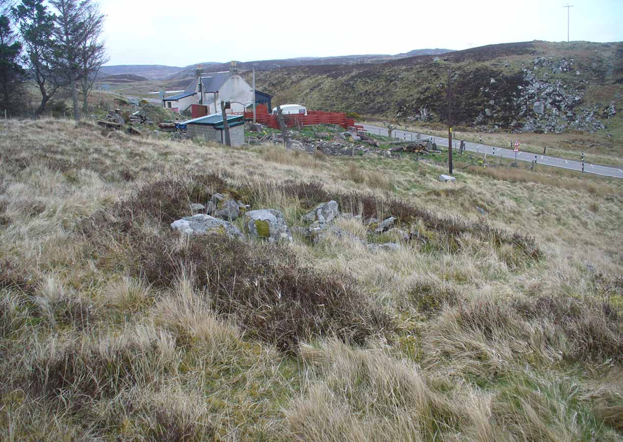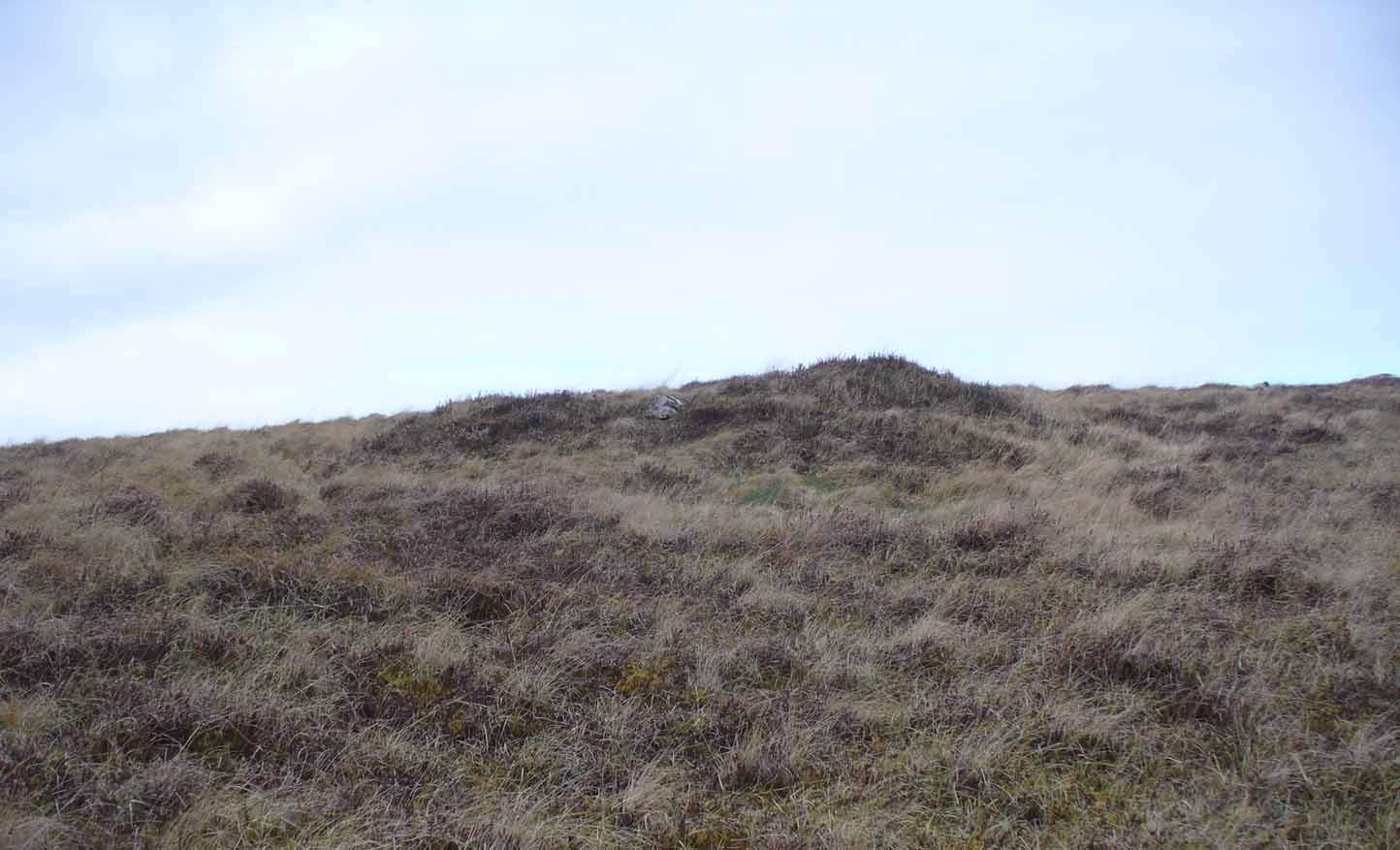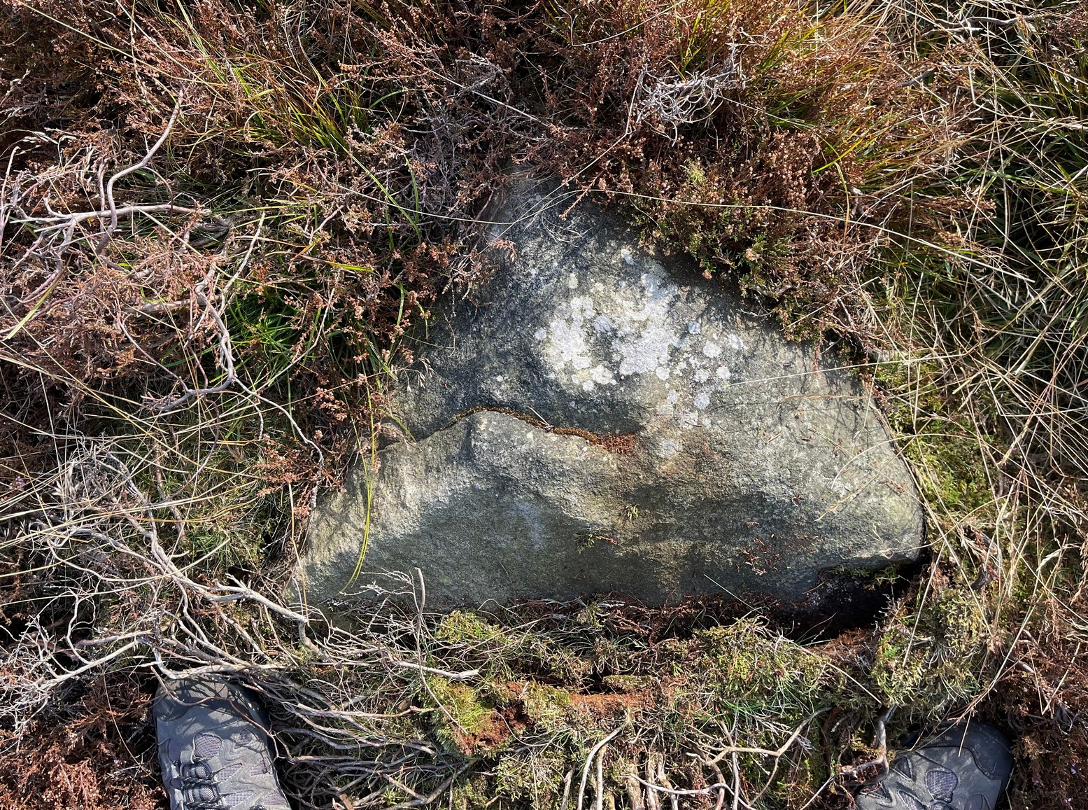 The most notable element is the single “cup mark” on the more easterly section of the stone, on one side of the natural crack. It catches your eye and is what makes you give the stone a little more attention, although I couldn’t make up my mind whether this was Nature’s handiwork or humans. It may be a bit of both. On the other side the crack we can see a small group of very faint eroded cup-marks — just! What seems to be three of them cluster in a small triangle formation, but one of these may be natural (tis hard to say for sure), with another isolated cup closer to the crack, and a final one further to the outer edge of the stone. All are very faint but stood out when the sun was low on our recent visit here. Give it your attention when you’re next having a look at the settlement and cairnfield close by.