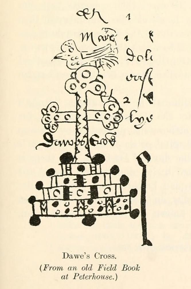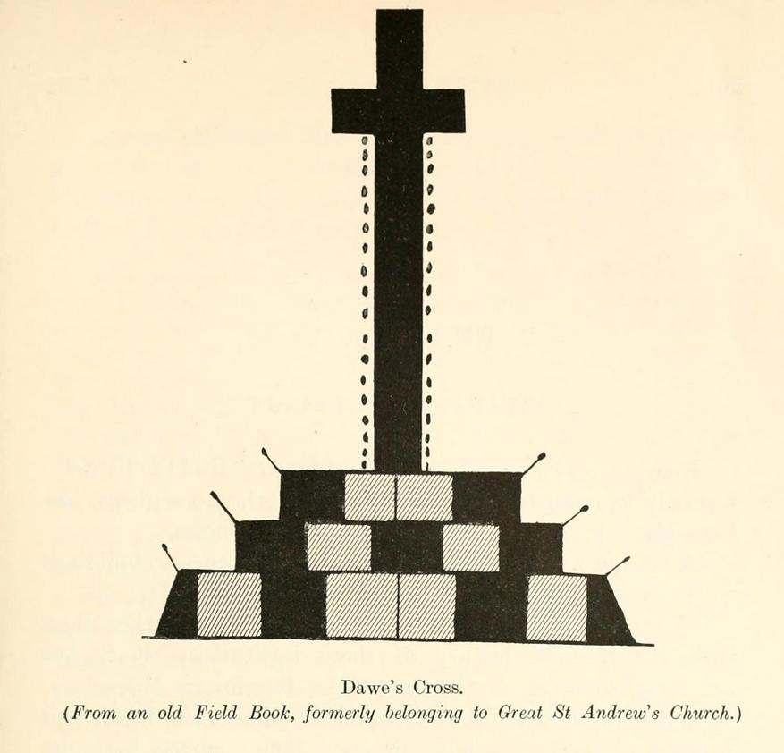 “In describing the lane called “Deepway” between the London Road and the Hadstock Way and known as “King’s Lane” from the latter road to Hinton Way, mention was made of a Cross (called Dawe’s Cross) which stood at what is now known as Hyde Park Corner. Dawe’s Cross is often mentioned in ancient deeds, and in an old Field Book, which formerly belonged to the vestry of the Church of St Andrew the Great, there was a most interesting representation of it. This is here reproduced…from a copy in the celebrated Bowtell MSS.”