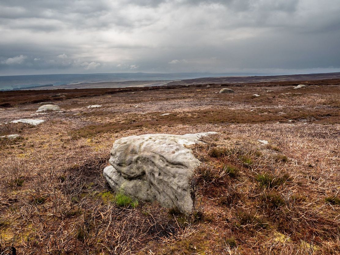 If you’re coming up from Otley or Askwith, take the same directions as if you’re going to visit the impressive Naked Jogger Carving (stone 612), not far from the well-known Tree of Life Stone. From the Naked Jogger carving, walk up to the small outcrop of rocks that bends above you. There’s a small collapsed line of walling just behind the outcrop. Walk along this up the slope as if you’re heading for the Sunrise Stone carving, but only 30 yards along, low down and right into the edge of the wall itself, you’ll see this elongated piece of stone. That’s the spot!