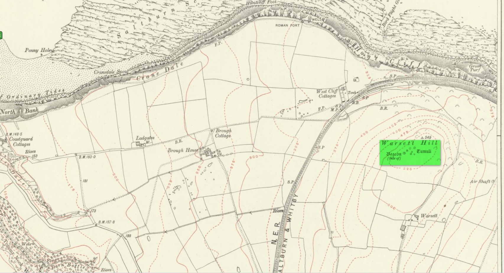 In medieval times this became a beacon site, where bonfires were lit.  I can find no further information about this. (NB: This site should not to be confused with another Warsett Hill that exists two miles southeast of here above Skinningrove.)