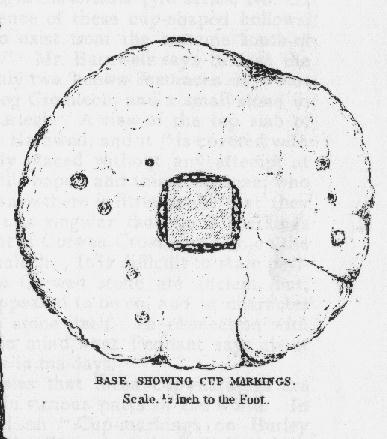 “The stone basement in which the (cross) shaft is placed is elliptical in form, with transverse and conjugate diameters measuring respectively 64 and 60 inches; it is 12 inches or so thick, is of a slaty nature and might have been procured in the neighbourhood… There are seven peculiar artificial depressions along the surface of the pedestal, strongly resembling the cup-markings which are found occasionally on the capstones of cromlechs, etc. They are irregularly arranged: on the north side there are three, almost in a line; and on other parts of the stone there are four of these marks. They differ somewhat from each other in size and shape, but they are for the most part circular, though one is more of an oblong than a circle. They vary also in depth, one being two-and-half inches deep, while the others are shallow. The largest is three inches in diameter; the others are not so broad.”