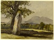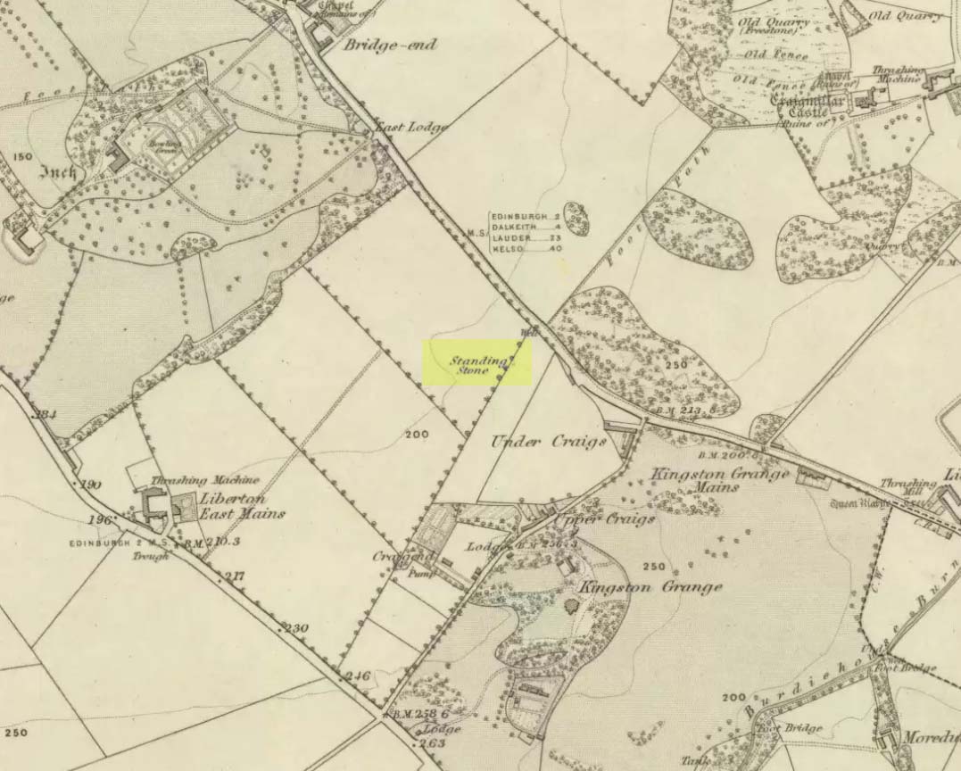 “About 40 yards from the main road near Little France…is a standing stone, which is set up without packing, with its main axis almost due north and south, but with a slight inclination towards the east. It stands 6¾ feet above ground, and has a girth of 6 feet 5 inches at 3 feet from the base. It is of grey sandstone, badly weathered on two sides and without traces of any artificial markings or design.”