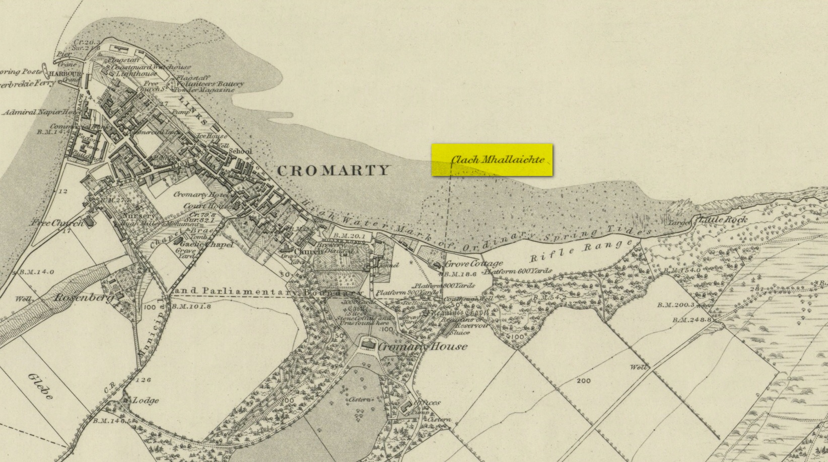 “A large stone Situate at the Low Water, and forming one of the boundary Stones of the burgh, the reason of its having this name is, that a young lad while Sitting on it was overwhelmed by the advancing tide and drowned, his mother when told of it, cursed the stone, hence the name Clach Mallach (Accursed Stone)”