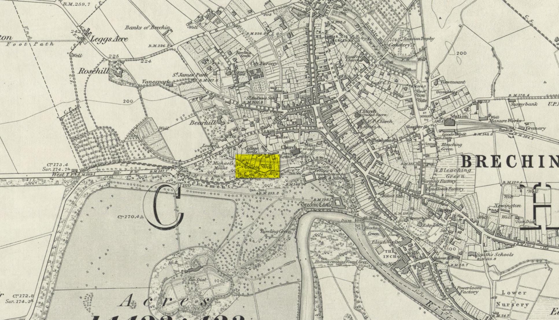 Highlighted on the 1865 OS-map, this lost water source was located between the Brechin cathedral/round tower and the curiously-named St. Michael’s Mount, whose history seems to be lost. It would seem to be the well which Ruth & Frank Morris (1981) name as the ‘Ancient Well’ in their survey.
