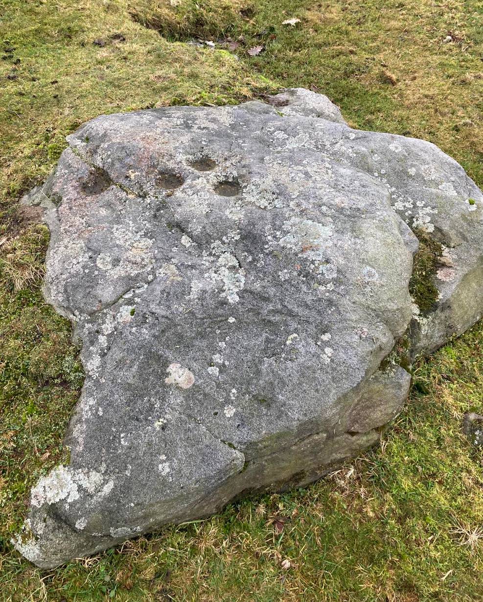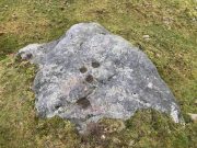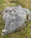 “It measures 38cm by 36cm and bears 29 small cup-marks and one slightly sinuous duct leading into what may be part of an earlier and larger cup. It also seems probable that additional cups were added in antiquity, since some are distinctly more shallow than others and, in one instance, two cups impinge upon one another. The stone had been broken in antiquity and may have come from a larger inscribed slab, as is perhaps the case with some other “portable” stones of burials or cairns and other monuments of the second this nature.”