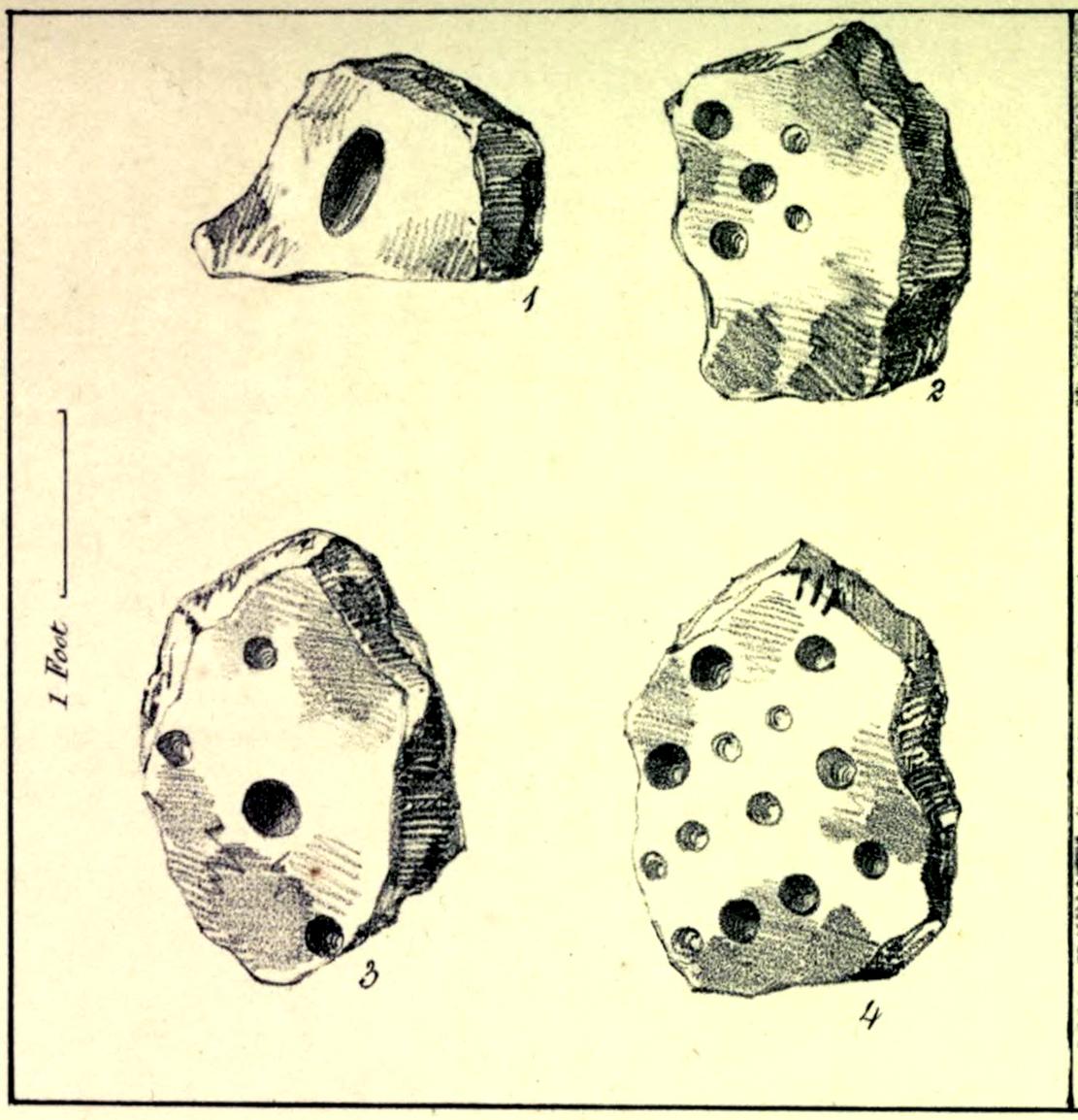 “It is an irregular mass of outcropping rock about 3 feet in diameter, and bears on its surface certain depressed markings supposed to represent a cow’s foot, a horse-shoe, and impressions which might be made by a man’s foot and knee in the act of kneeling. The markings appear to be natural.”