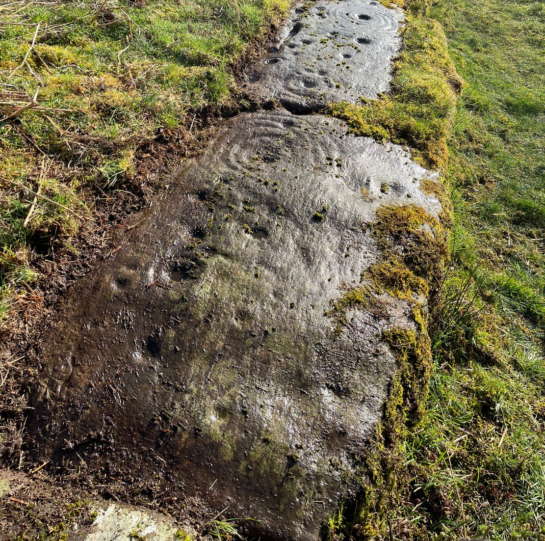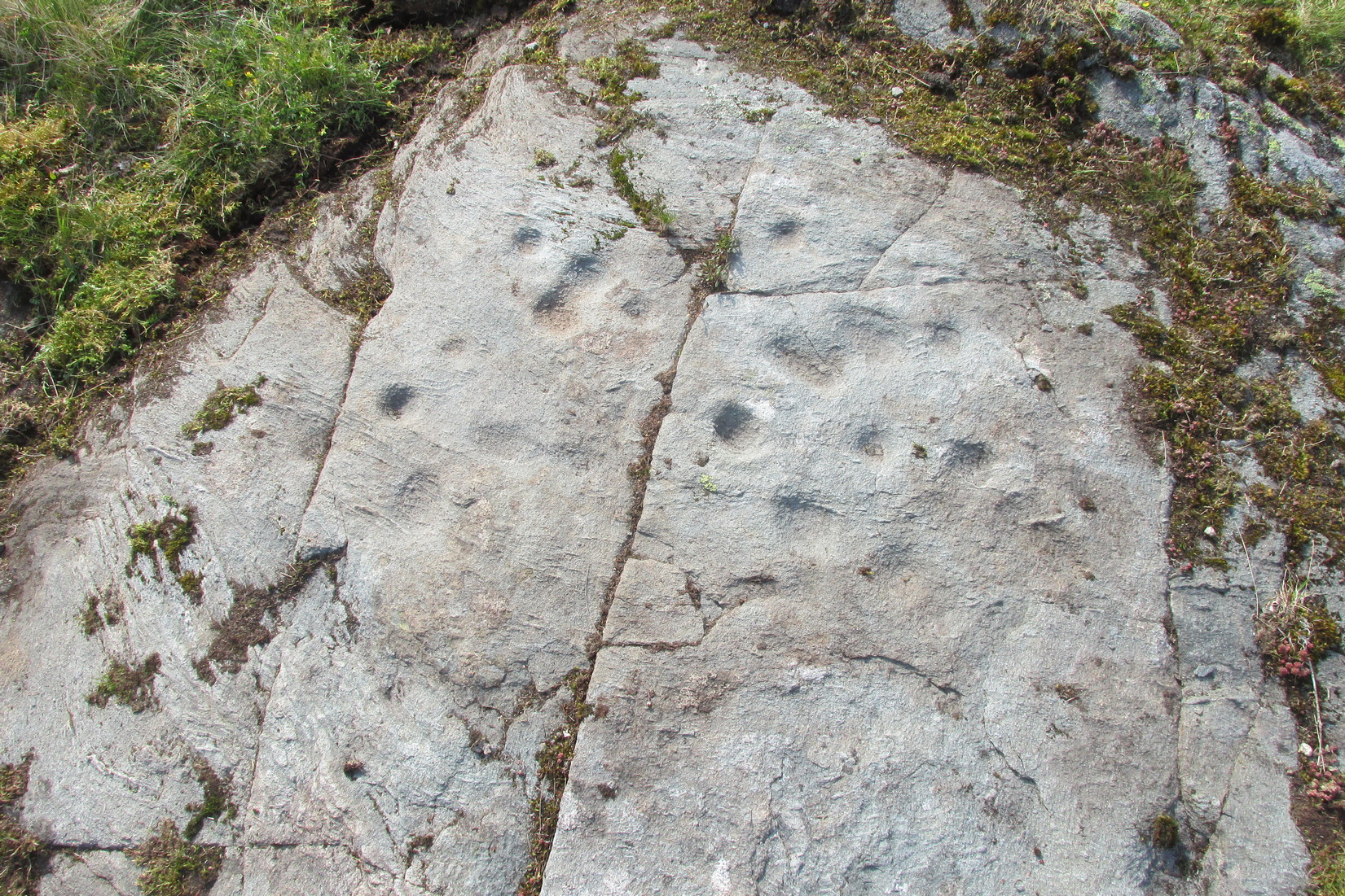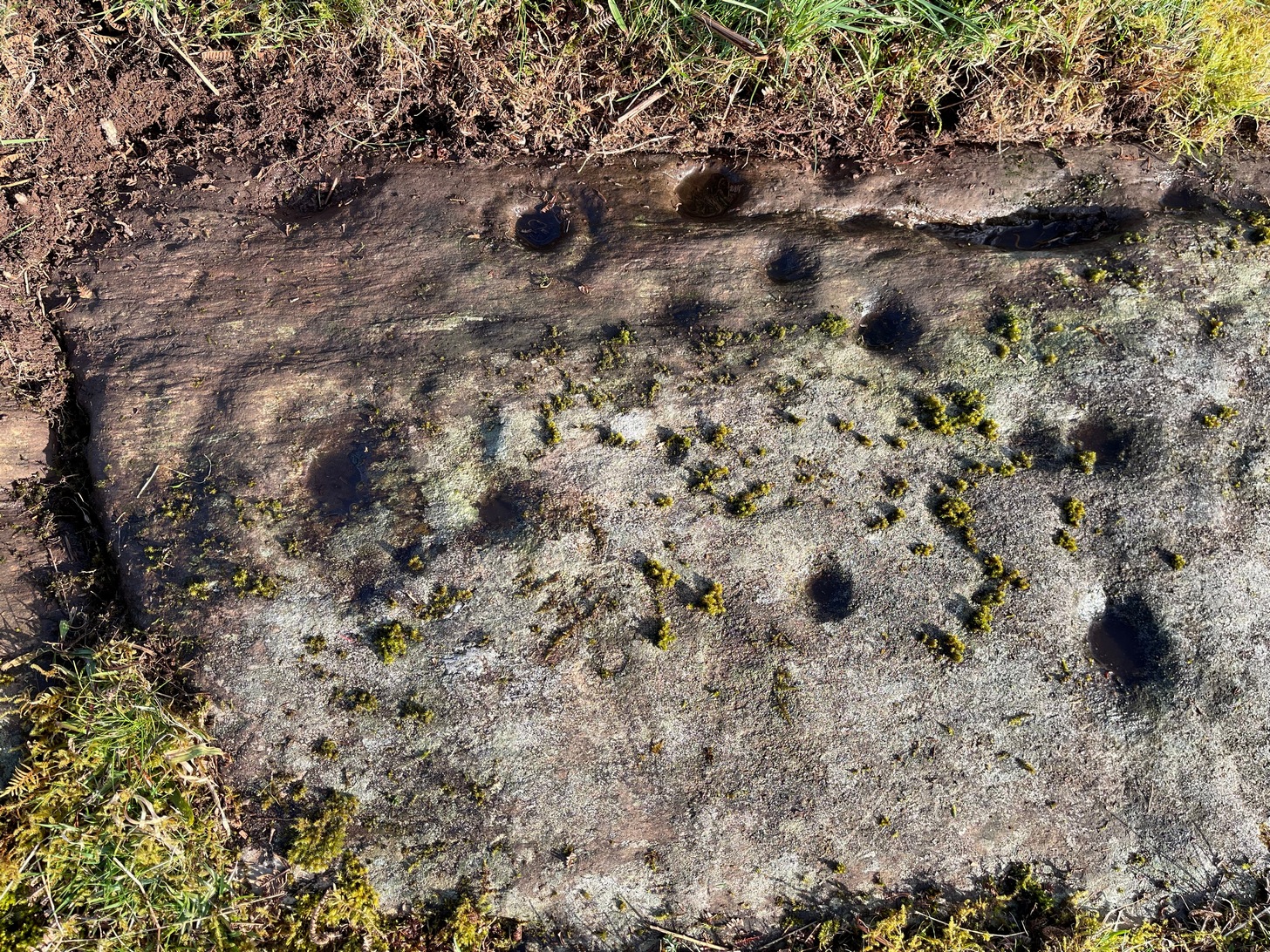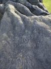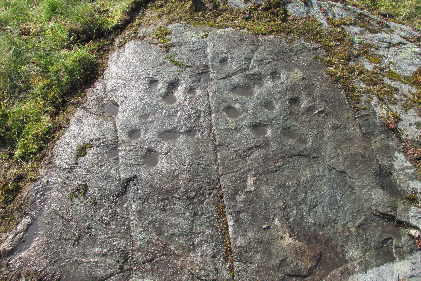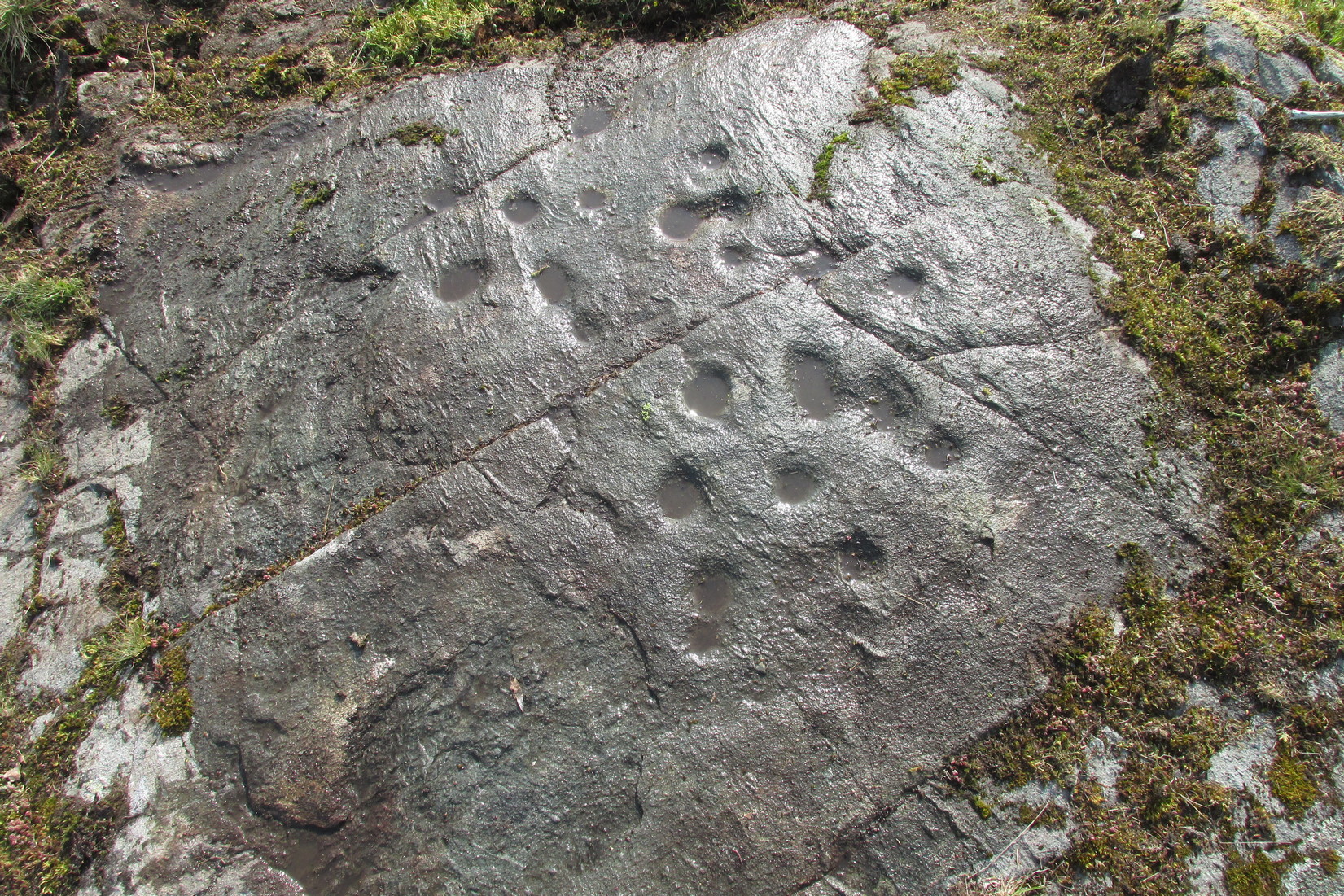 The distinctive section of this petroglyph are the deep cup-marks on its northern side: fourteen of them, three of which have faded shallow rings around them—or rather, uneven oval-shaped surroundings. The cup-marks have obviously been worked and re-worked over the centuries, whereas the rings were given less repetitive attention, for whatever reason. This is a pattern found at a great number of cup-and-ring stones across the country.