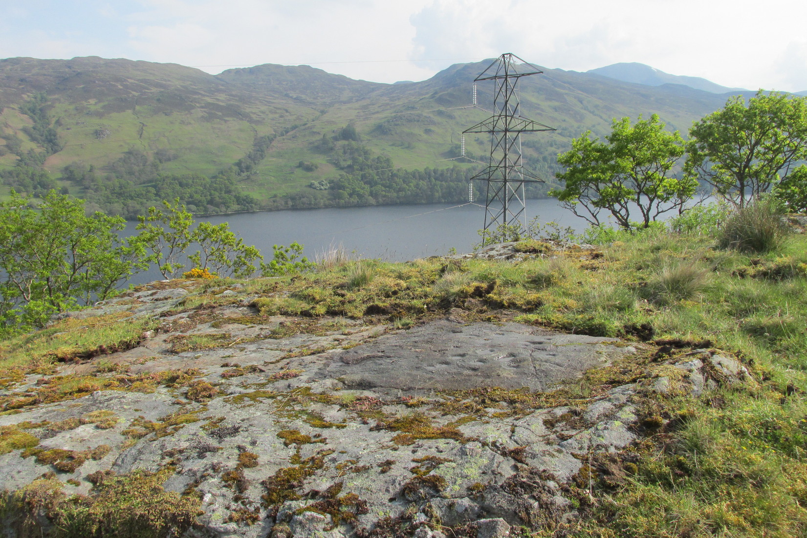 Along the A827 Loch Tay road, halfway between Fearnan and Lawers just beyond the forestry, a track goes up into the fields across from Feadan house (big shed above you in field). Careful, or you’ll miss it. Go up here and head all the way up the steep winding track for 700 yards (as the crow flies) until, where the land starts levelling out, you hit the long straight line of old walling. Go over it and walk to your right (northeast) for a few hundred yards until it bears sharp left (NW), keep walking along it for another 45 yards and, where the fence turns down to the water, just keeping walking up the slope to the scatter of rocks. Look around!