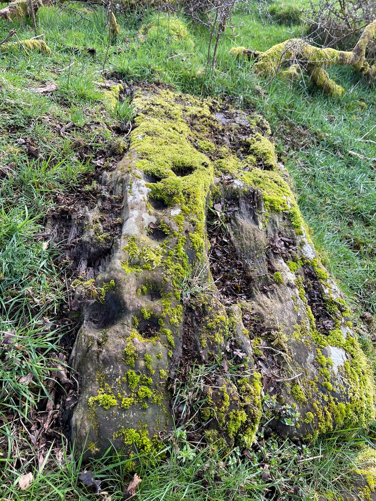 The rock surface continues for quite some distance all round here in the shape of a large dome, much of it covered in vegetation of varying depths. There are openings showing the bare rock and, at several other spots there are several other cup-marks, although none are as deep as the ones we’ve just described. On the edge of one piece, about three yards north of the deep cups, a couple of worn cup-marks are near the edge of one rise; two others are clearly notable a yard or so WNW of the deep cups; whilst there are several other single cups near and not-so-near of the main design. It all requires a lot more work before we see the entire picture.