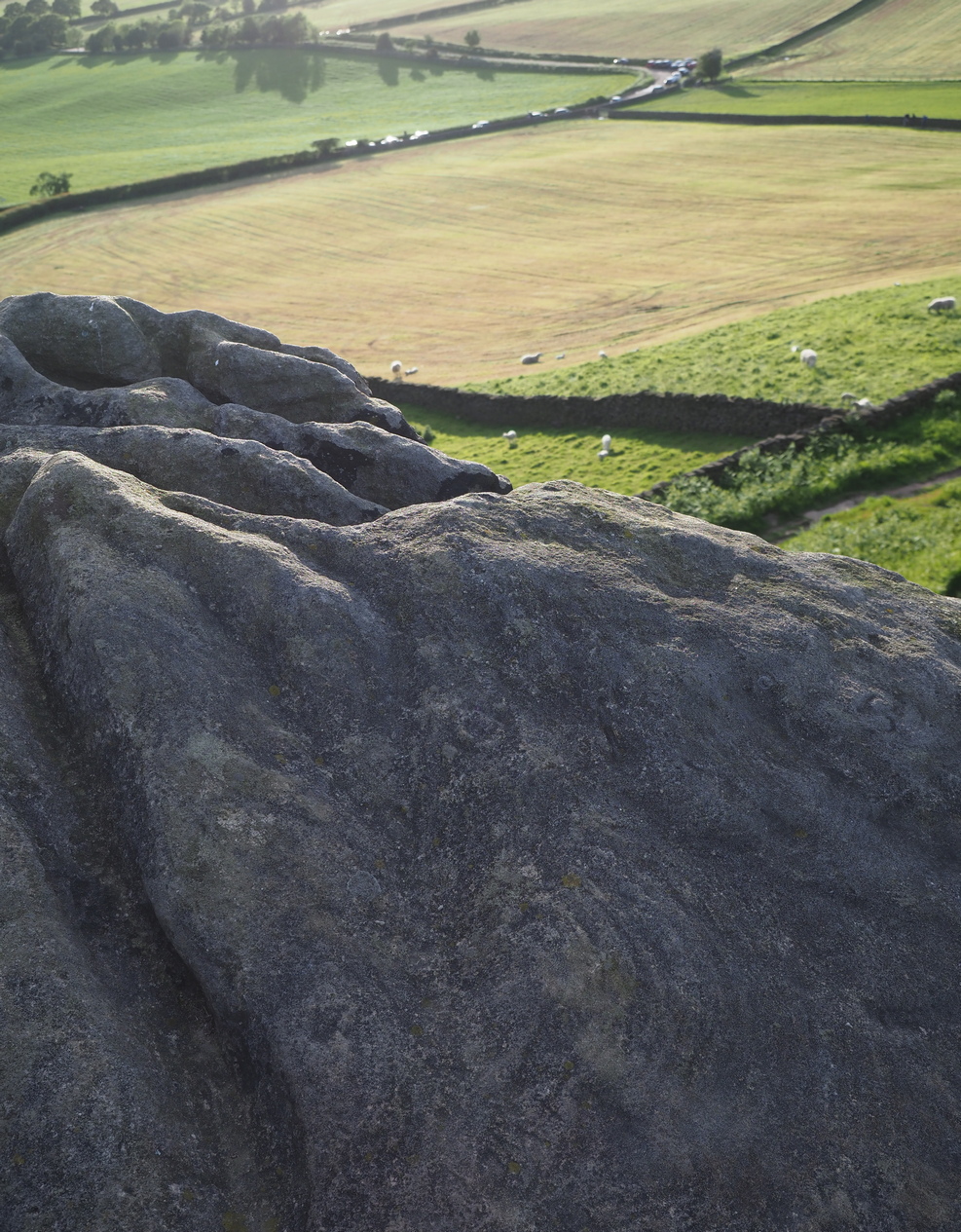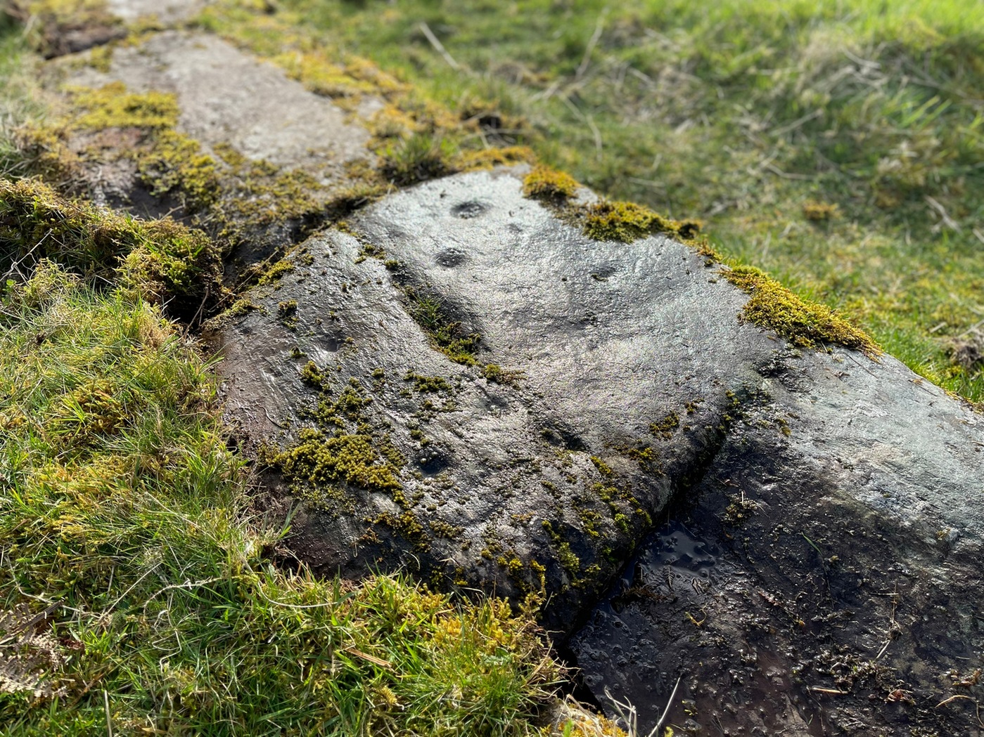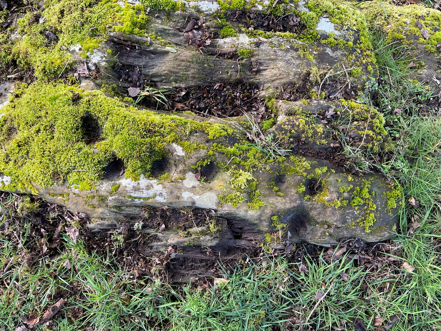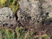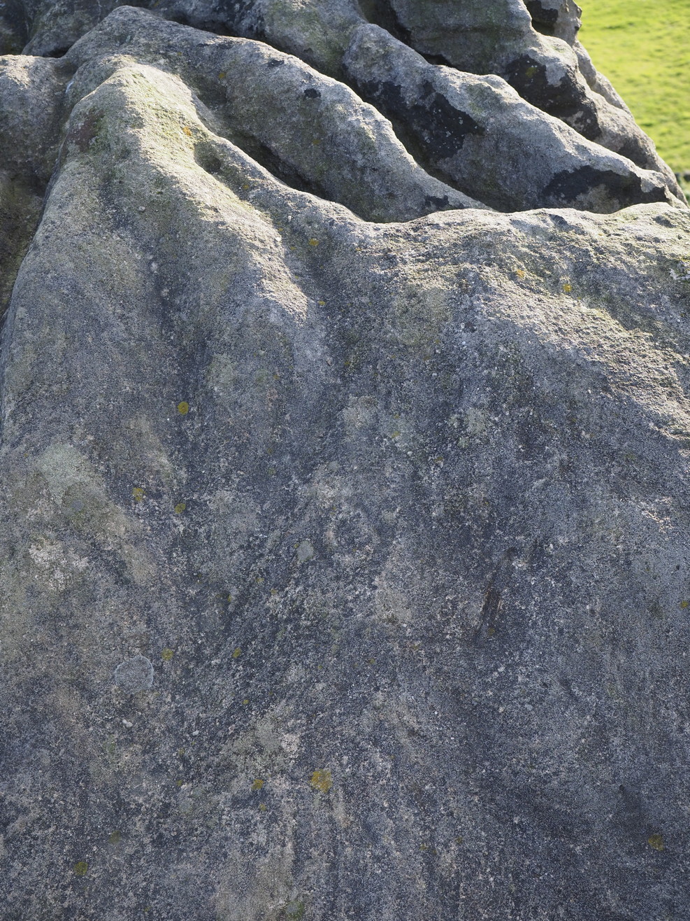 When you consider there are multiple-ringed carvings close by on the same geological ridge as this carving, there’s little wonder this fella hardly gets any attention: the design here is nothing special compared to its close neighbours. That aside: on this small flat surface we have six or seven simple cup-marks; most of them quite small, with the largest of the lot having what looks like a small carved arc around one side of it—although I couldn’t make my mind up one way or the other to be honest. A few more visits might prove more conclusive.