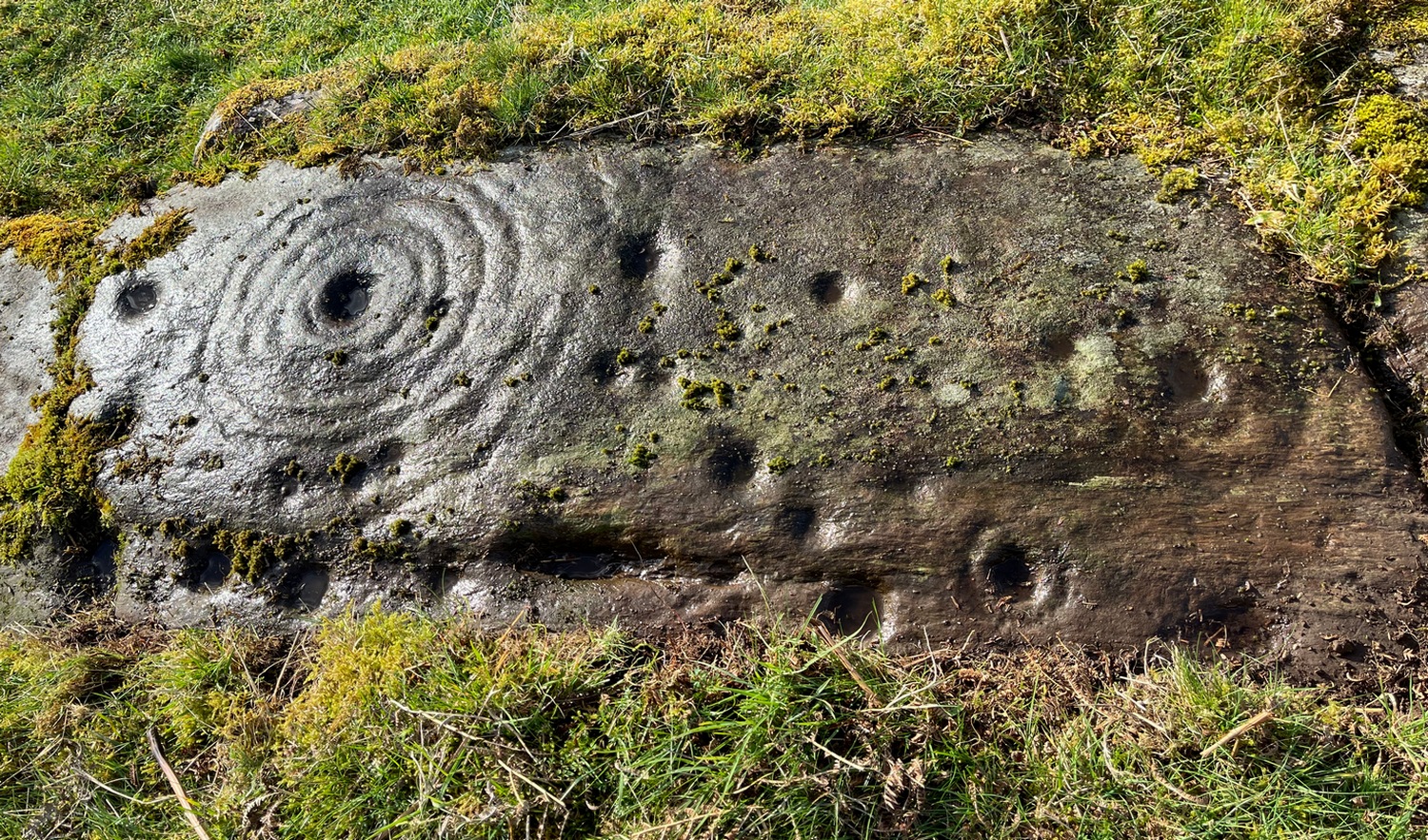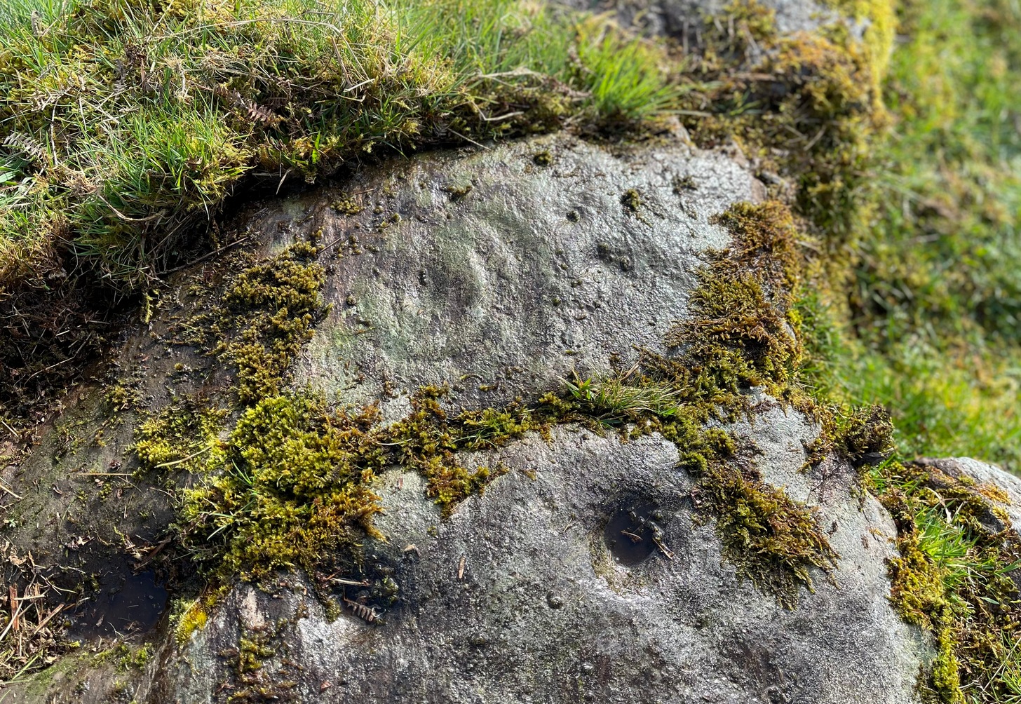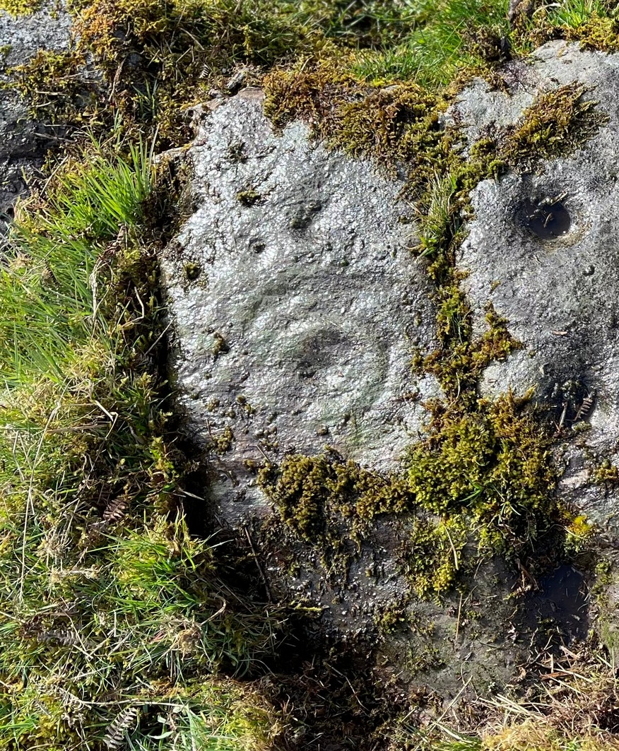 Described, albeit briefly, in the superb survey by Gardiner, King & MacInnes (2024), the carving here has been cut into a sloping straight line of rock along the ridge of a very tiny cliff and consists of cups, single rings and multiple rings. At its crown, so to speak, where the rock surface levels out and is flat, a very well-preserved multiple cup-and-ring greets our senses: a cup-and-four rings to be precise. The outermost edge of the rings cuts into a natural crack that runs to the edge of the stone; and close to where this crack reaches the edge, another standard cup-and-ring rests against it. On this same section you’ll see a single cup which, by the look of it, was intended to have a much wider ring surrounding it—but for some reason it was never executed.