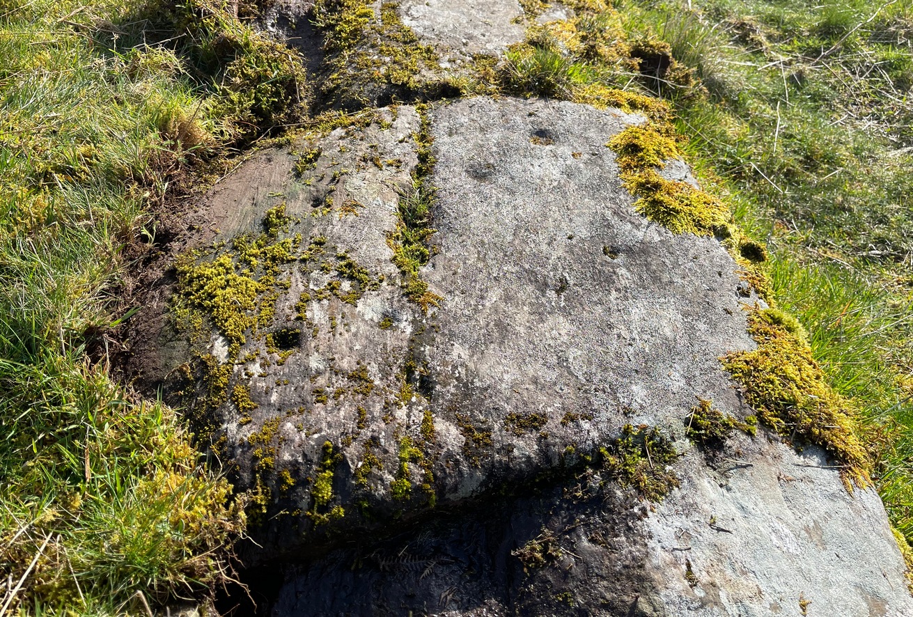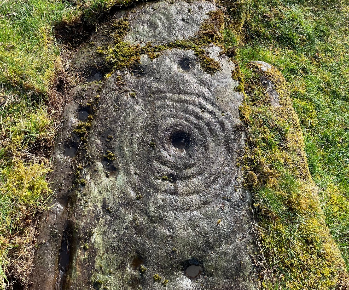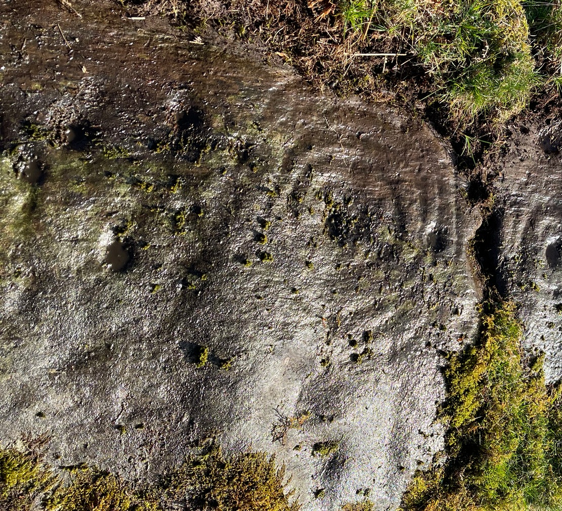 Described, albeit briefly, in the superb survey by Gardiner, King & MacInnes (2024), the carving here has been cut into a sloping straight line of rock along the ridge of a very tiny cliff and consists of cups, single rings and multiple rings. At its crown, so to speak, where the rock surface levels out and is flat, a very well-preserved multiple cup-and-ring greets our senses: a cup-and-four rings to be precise. The outermost edge of the rings cuts into a natural crack that runs to the edge of the stone; and close to where this crack reaches the edge, another standard cup-and-ring rests against it. On this same section you’ll see a single cup which, by the look of it, was intended to have a much wider ring surrounding it—but for some reason it was never executed.
