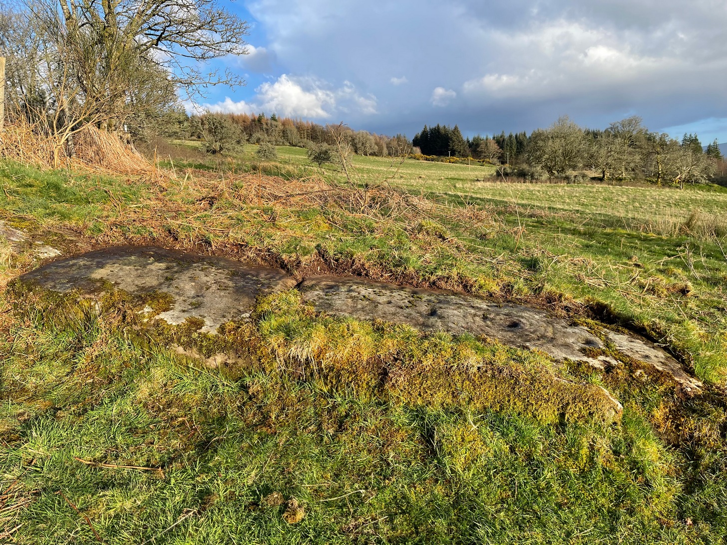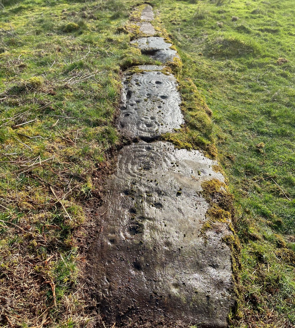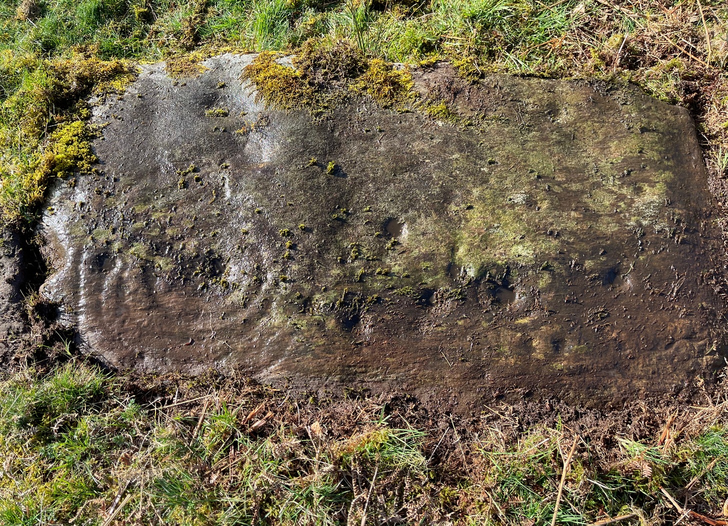 Take the same directions as if you’re visiting the Tormain (1) carving (the best one of the bunch here), but about five yards before reaching it, to your immediate left, just at the edge of where the hill drops down slightly, you’ll see a small flat rock poking out of the ground that may have been cut and quarried at some time in the past. That’s the one!