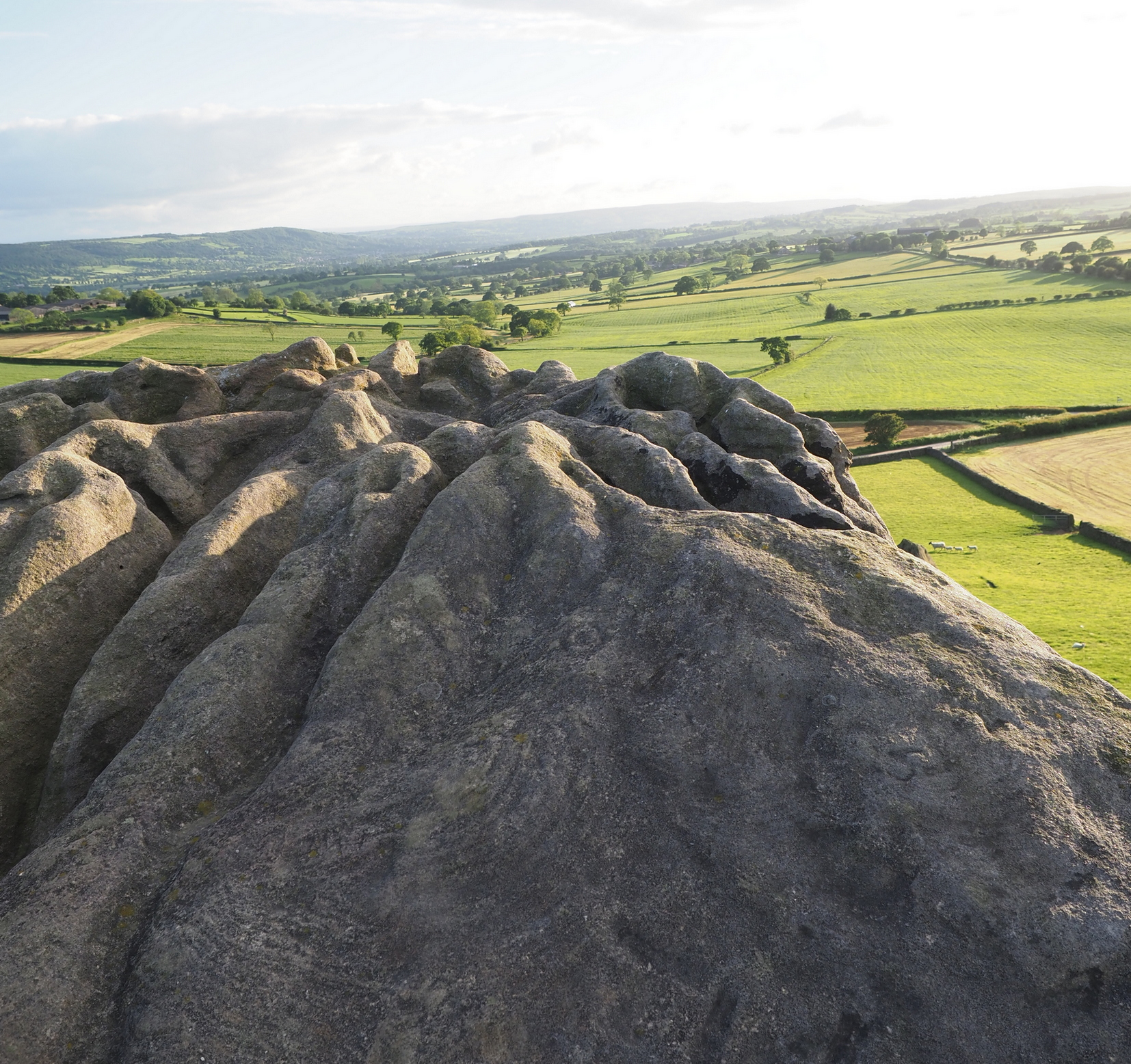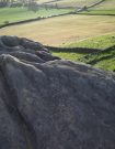 As we move down the slope of the rock with its veritable scattering of geological splits, the rest of the design consists of several single cup-and-rings—at least three of them—over its lower-half, almost in a gentle arc over the surface. The one closest to the four-rings has a single cup-mark attached to its outer edge and another single one just a few inches away from it. The others don’t seem to have any additional carved features attached to them; although one or two other singular cup-marks can be seen on this, the lowest section of the carving.
