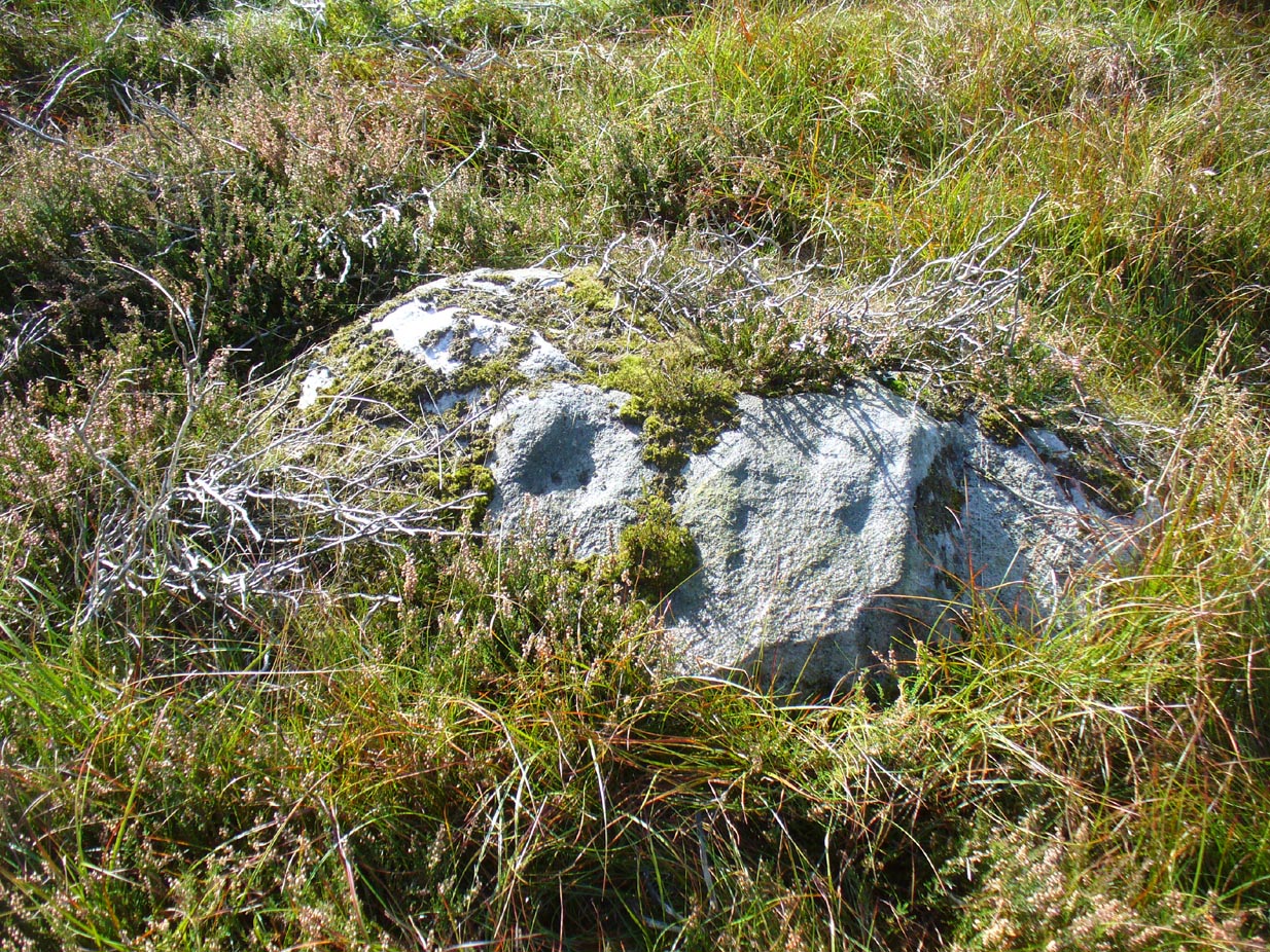 The most notable feature to this carving is the arrangement of the great majority of the cup markings. They were quite deliberately carved along the very top of the stone, close to its edge, in two contiguous lines of nine with a small gap separating them. At the northwestern end of this, a very notable feature occurs: a natural crack in the rock runs down the stone and, almost all the way down, we find a line of cups have been pecked onto the stone along the natural crack, with some of them near the top that are unfinished. These cup-marks are more elongated in form than the usual circular status; but this is due to them being etched into the cleft itself. From top to bottom there are 13 such cups. At the bottom of this line, another linear stretch of cups change direction and move back onto the main rock surface, just above another large long natural crack cutting across the rock. This gentle arc of cups (with two other possible cups beneath these) ends at a cup-and-ring, above which are two extra cups next to each other. Above these are a number of other cups of roughly similar size and depth, with a notably large one that gives the impression that the smaller cups around its edges are satellites to its larger parent body.
