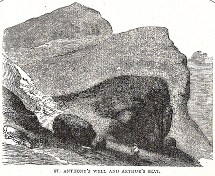 “The ancient Hermitage and Chapel of St. Anthony, underneath the hangings of Arthur’s Seat, are velieved to have formed a dependency of the preceptory at Leith, and to have been placed there, to catch the seaman’s eyes as he entered the Firth, or departed on some long and perilous voyage; when his voews and offerings would be most freely made to the patron saint, and the hermit who ministered at his altar. No record, however, now remains to add to the tradition of its dedication to St. Anthony; but the silver stream, celebrated in the plaintive old song, ‘O waly, waly, up yon bank,’ still wells clearly forth at the foot of the rock, filling the little basin of St. Anthony’s Well, and rippling pleasantly through the long grass into the lower valley.”