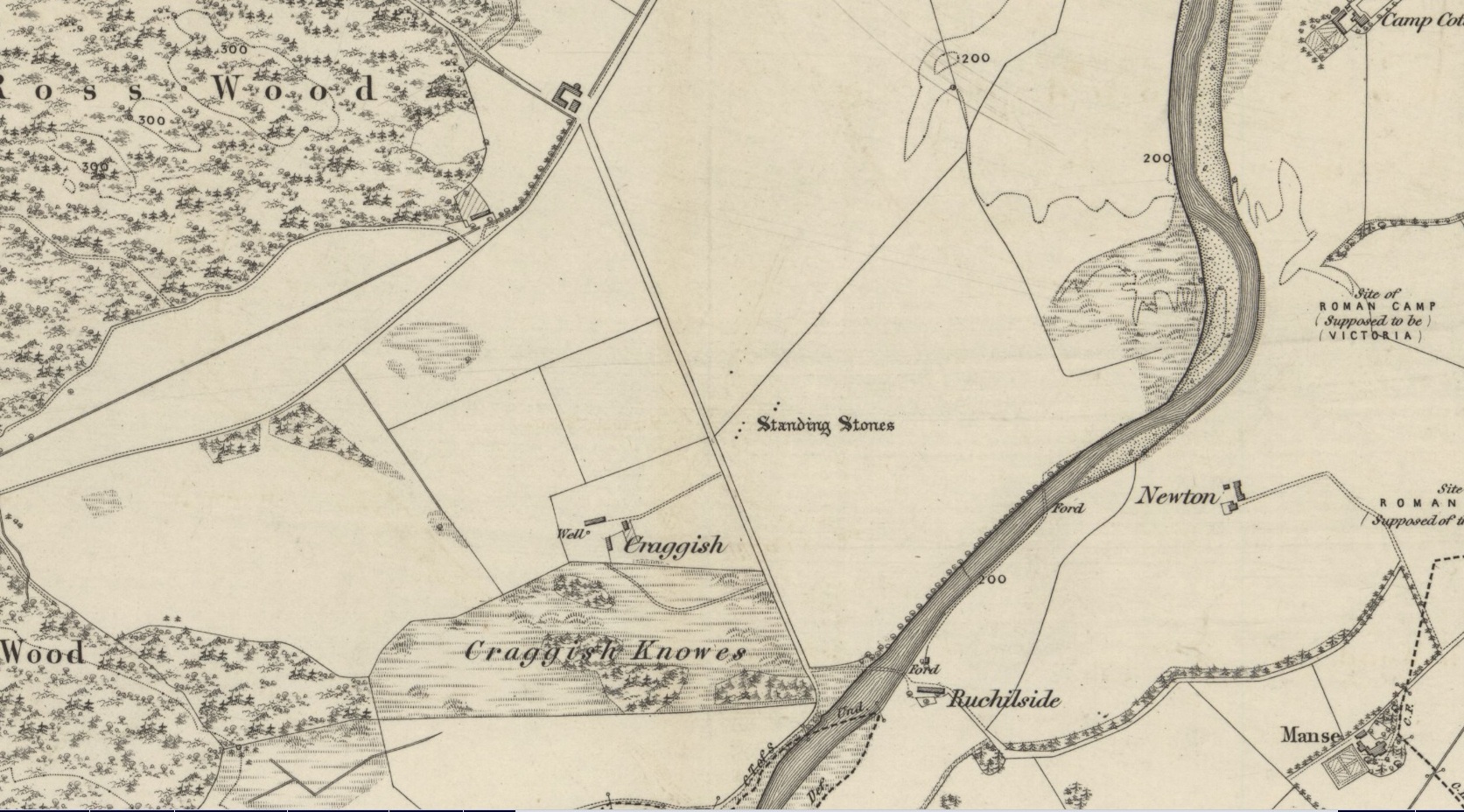 More than a hundred years ago when John MacPherson (1896) wrote his essay on the history of this area, he described there being “three large stones, supposed to be the remains of a Druidical temple.” He was talking about the Roman Stone here, with its two companions—although only the Roman Stone remains upright today. He noted that one of them, on the ground was “a round, flat boulder” which “bears upon its surface cup-marks arranged in irregular concentric circles.”