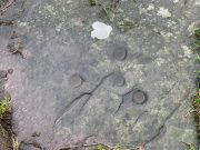 “Low, medium striated rock lying in slope of hill. SE end carries possibly up to eleven cups, possibly two sets grouped in arcs running into natural striations of rock, one of which may have been artificially enhanced by pecking.”