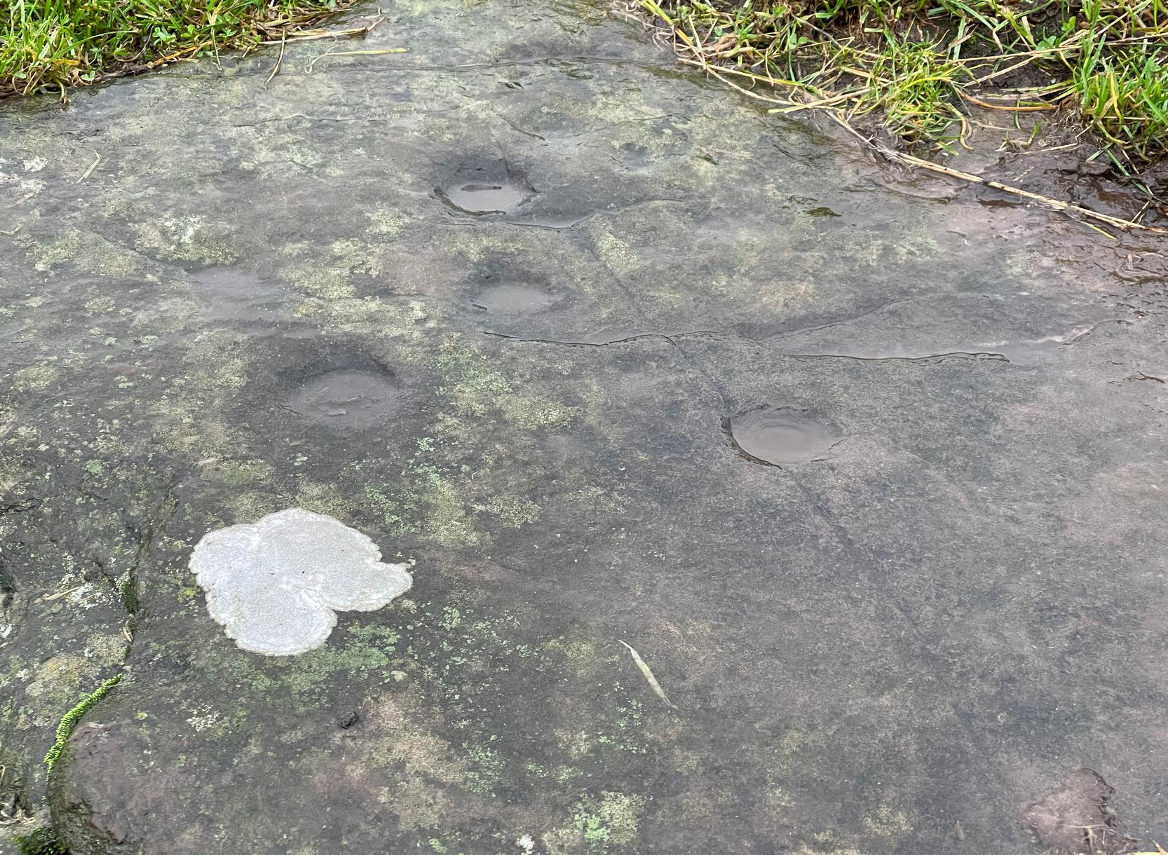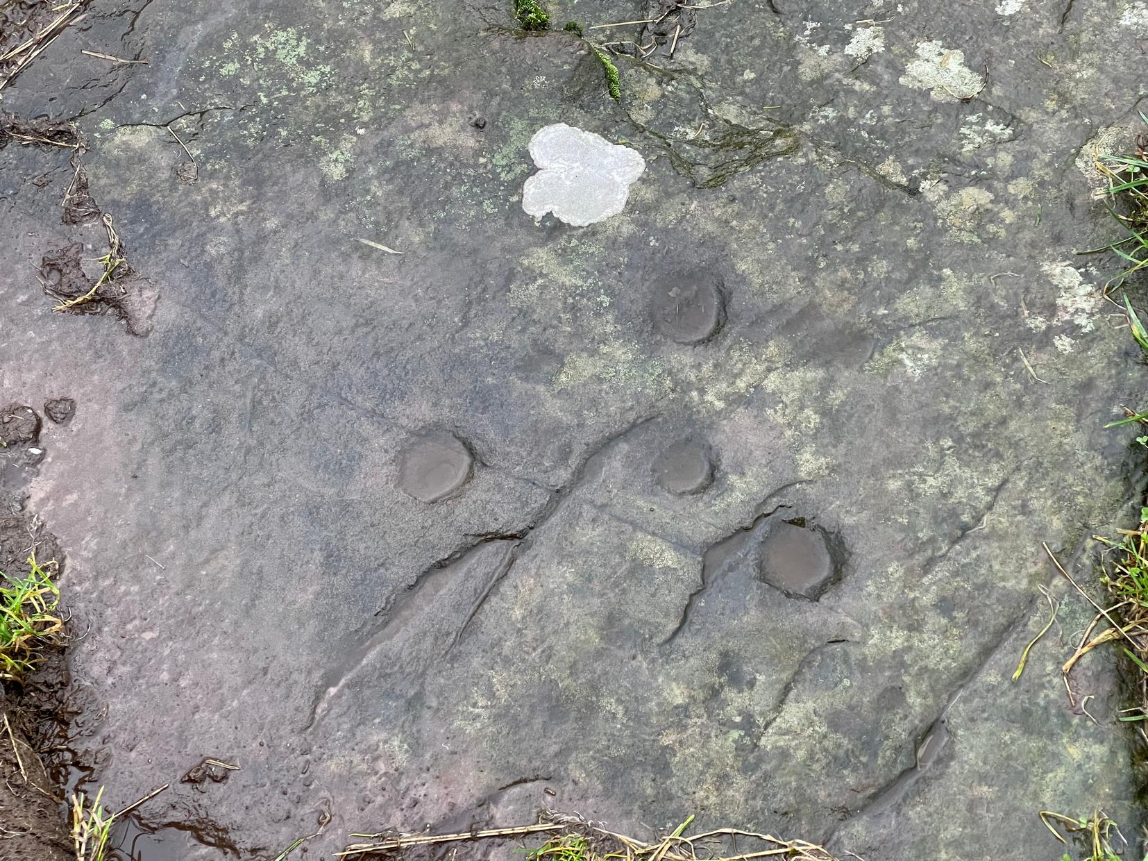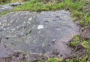 “It measures 38cm by 36cm and bears 29 small cup-marks and one slightly sinuous duct leading into what may be part of an earlier and larger cup. It also seems probable that additional cups were added in antiquity, since some are distinctly more shallow than others and, in one instance, two cups impinge upon one another. The stone had been broken in antiquity and may have come from a larger inscribed slab, as is perhaps the case with some other “portable” stones of burials or cairns and other monuments of the second this nature.”