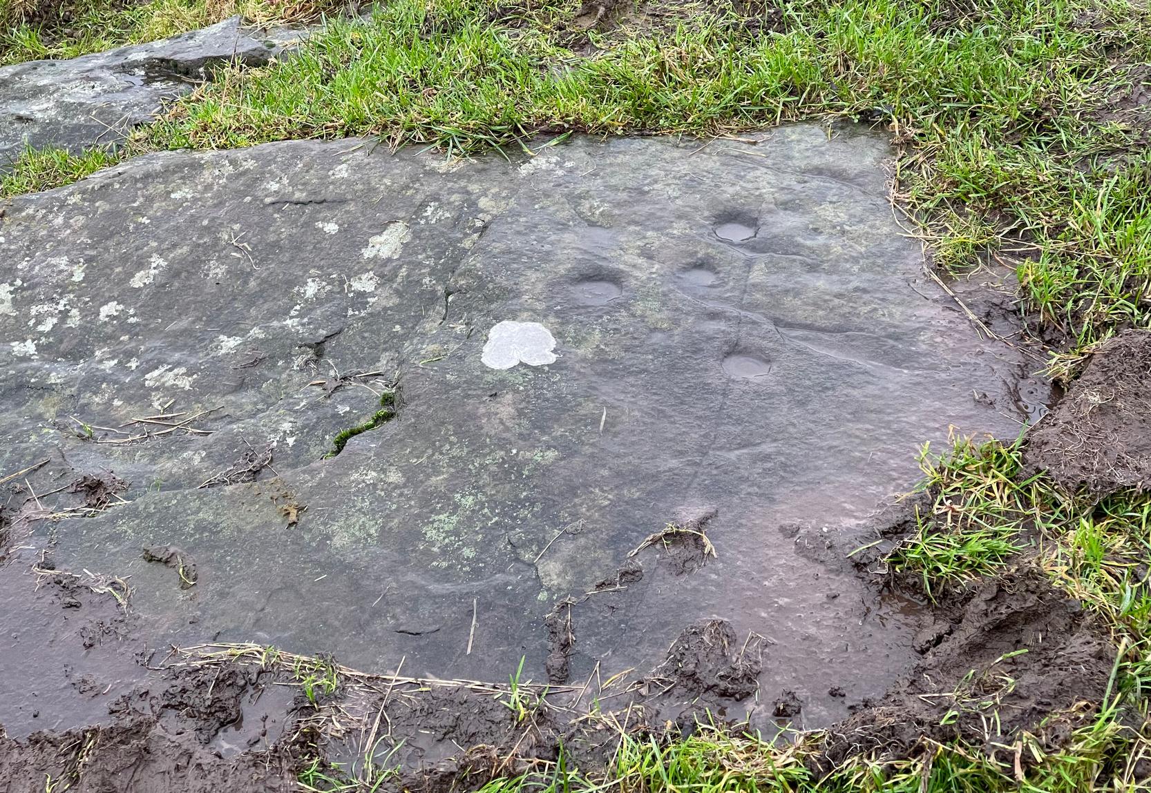 On this somewhat isolated stone on the northern sloping edge of Craven Hall Hill we find a small cluster of shallow cup-marks, first noted in the 1980s and eventually mentioned in a survey by Boughey & Vickerman (2003) where they described it as a,
