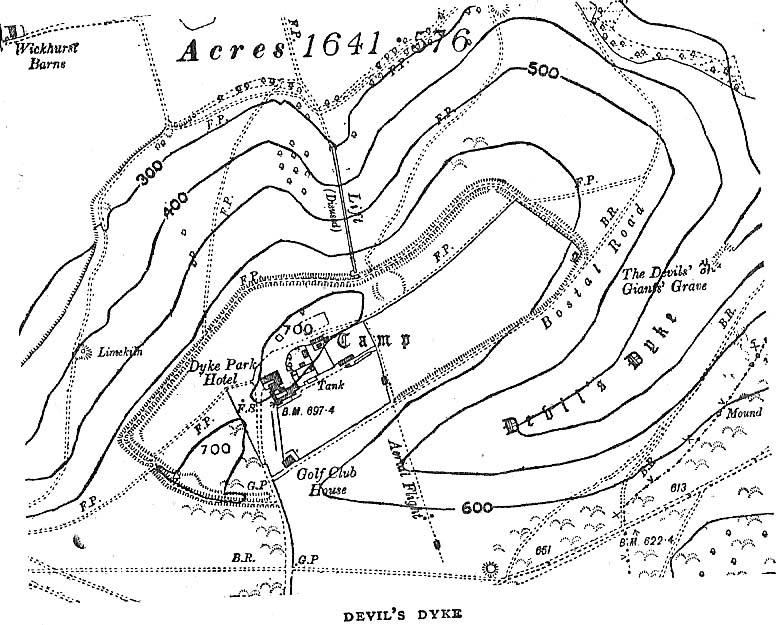 Nowadays it seems, the Devil’s Dyke is the name given to the steep valley below the encampment, but a hundred years back it was the camp itself that was known by this name. Described by the wandering antiquarian R. Hippisley Cox (1927) as “a camp containing forty acres (with) very steep and difficult approaches,” another early account in The Antiquaries Journal — commenting on a ground-plan of the site from the Brighton and Hove Herald of 1925 — told: