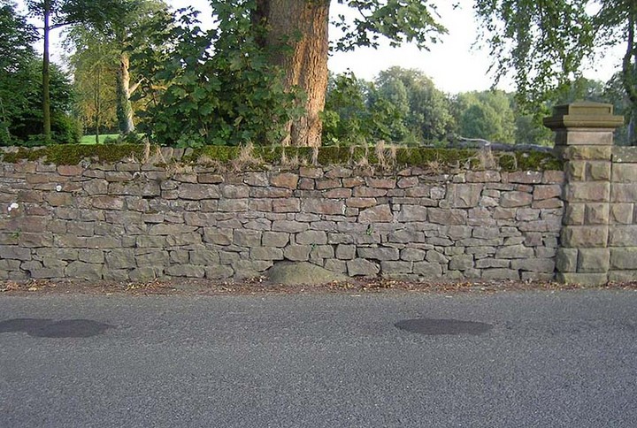 The best way to locate this is probably by starting from the pub opposite the old church of St. Leonard and heading west along the village road, past three large gate-entrances, until reaching the conspicuous milestone by the road junction. On the other side of the road, just before the gate entrance to Downham Hall, edged into the base of the wall, we find this ‘ere The Great Stone.