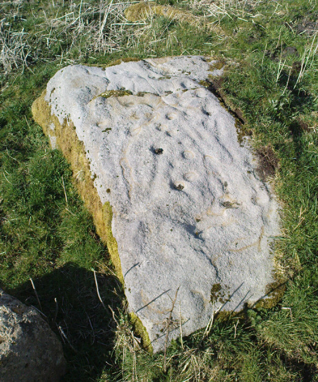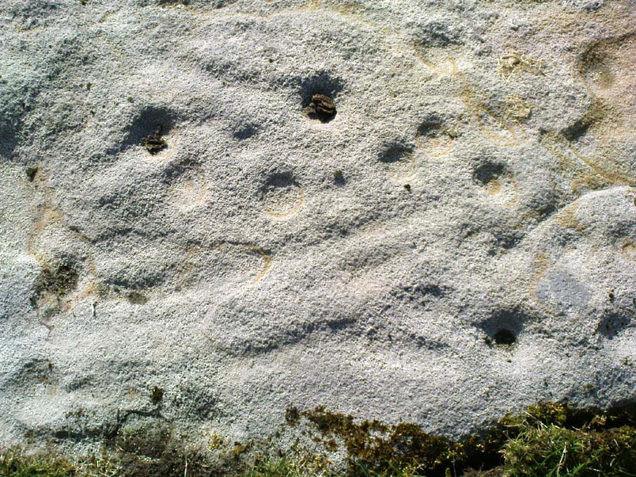 “two detached masses of rock, standing alone upon the moor. The first is 14ft in length by 8ft in height, tapering to the ground; a set of cups and channels occupy the highest point. The other, distant 13 yards, is of an irregular square form, 45 yards in circumference and 7ft high. This stone appears to be tilted on its edge, presenting its cleavage upwards, and has hollows containing water, but is so much wasted above that if it has ever borne the cups and channels, they are now obliterated.”