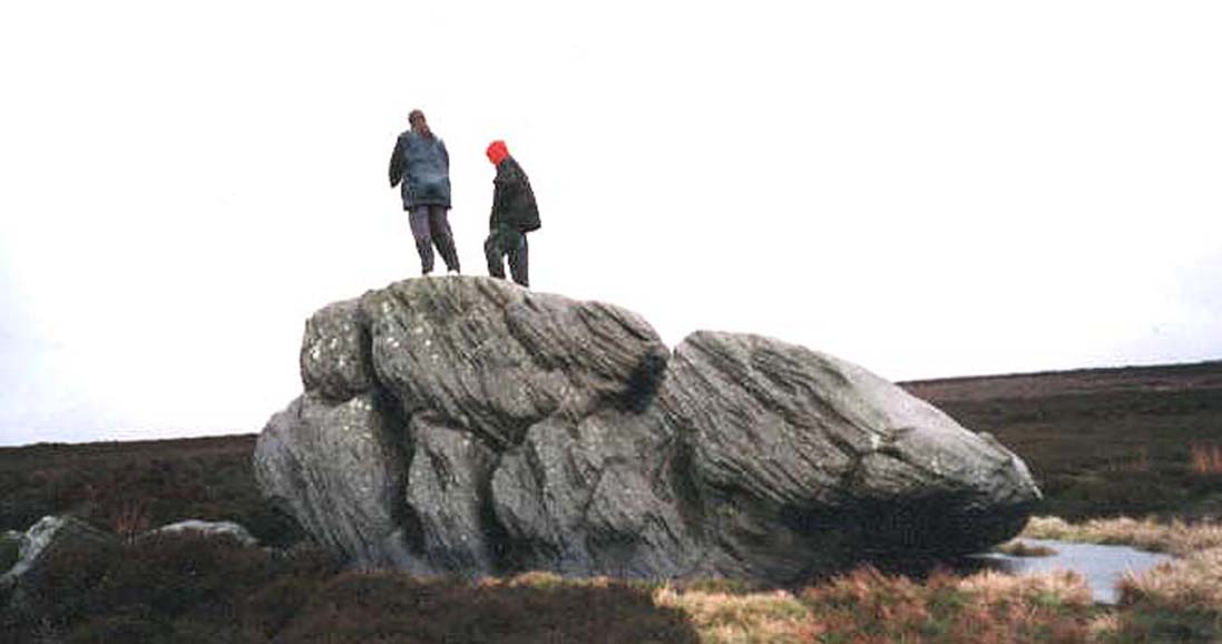 By whichever route you wanna take, get y’self to the prominent cup-and-ring marked rocks known as the Thimble Stones near the very top of these moors. From here, walk roughly 400 yards southwest onto the bare open moors (there are no footpaths here) and you’ll see these two isolated prominent boulders living quietly on their own. You can’t really miss ’em! You’re there.