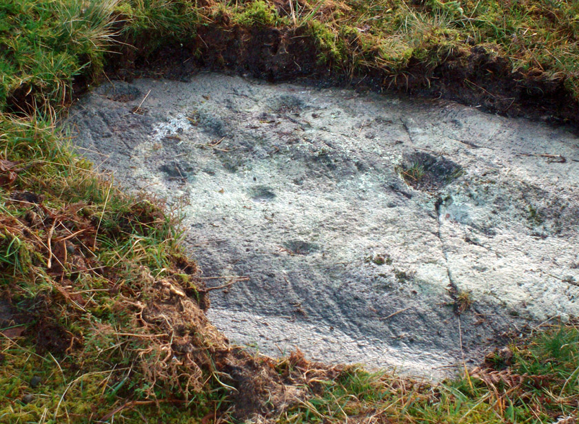 As we move down the slope of the rock with its veritable scattering of geological splits, the rest of the design consists of several single cup-and-rings—at least three of them—over its lower-half, almost in a gentle arc over the surface. The one closest to the four-rings has a single cup-mark attached to its outer edge and another single one just a few inches away from it. The others don’t seem to have any additional carved features attached to them; although one or two other singular cup-marks can be seen on this, the lowest section of the carving.