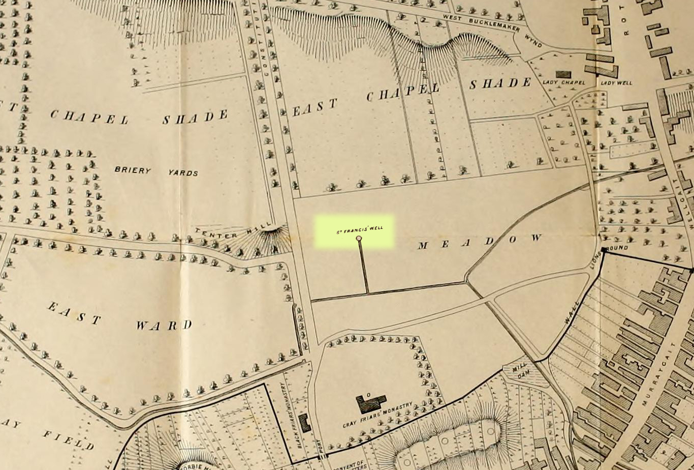 “When the Friars’ house was in ruins, and the gardens laid waste, St. Francis’ well did not escape unharmed. One austere iconoclast—James Patrie was his name—had probably been offended at its sculptural reminiscences of the old faith, and he cast it down. When arraigned to answer for this,
