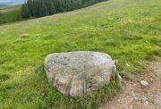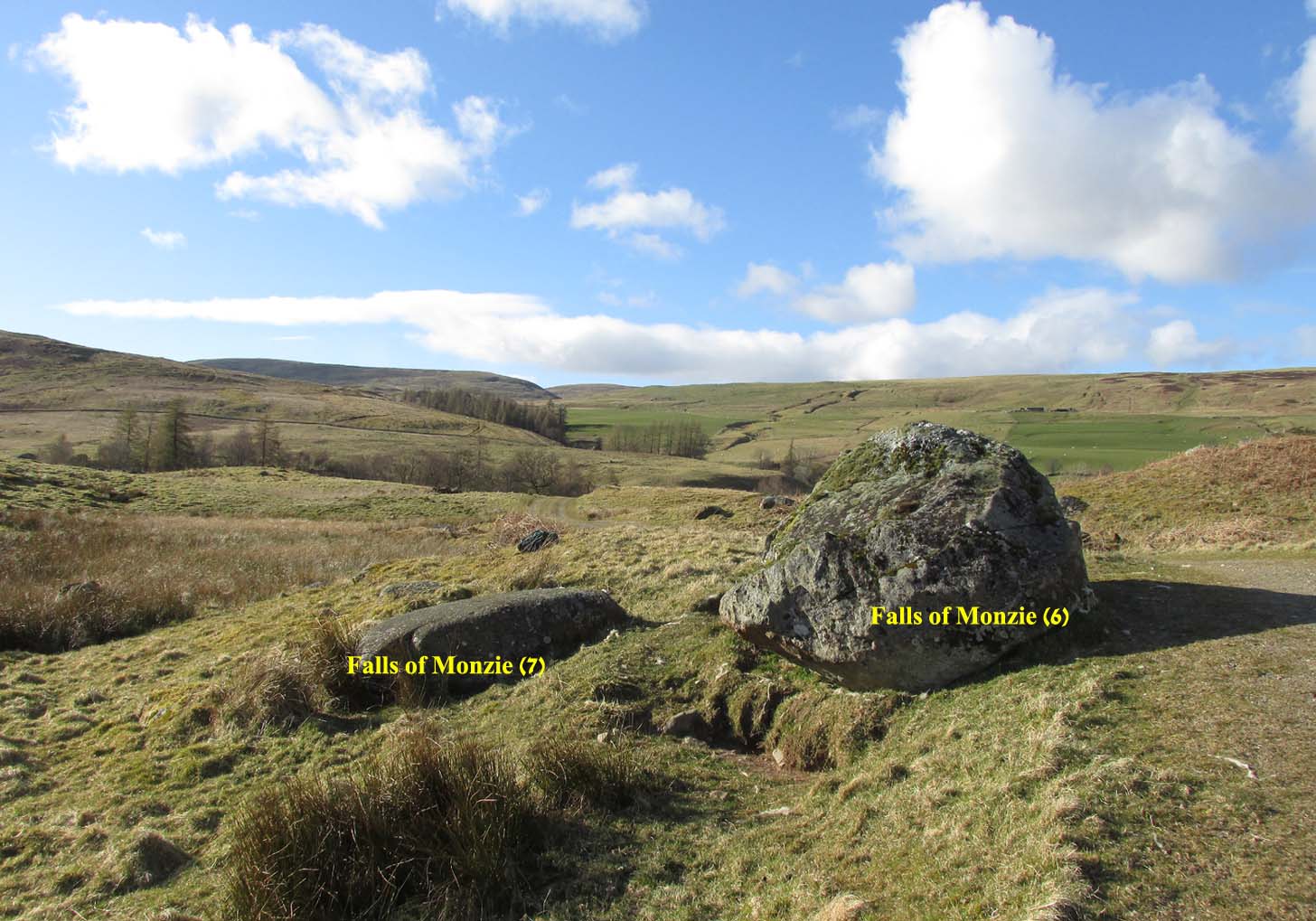 A couple of miles east of Crieff, take the A822 road from the Gilmerton junction towards the Sma’ Glen. After literally 1¾ miles (2.8km)—just 100 yards before the track up to Connachan Farm—you’ll reach a dirt-track on your left that leads into the hills. Go on here and after an easy walk of 400 yards or so, you’ll reach the conspicuous boulder known as the Falls of Monzie (6) stone. Two or three yards to its side is a large flat stone. That’s it!