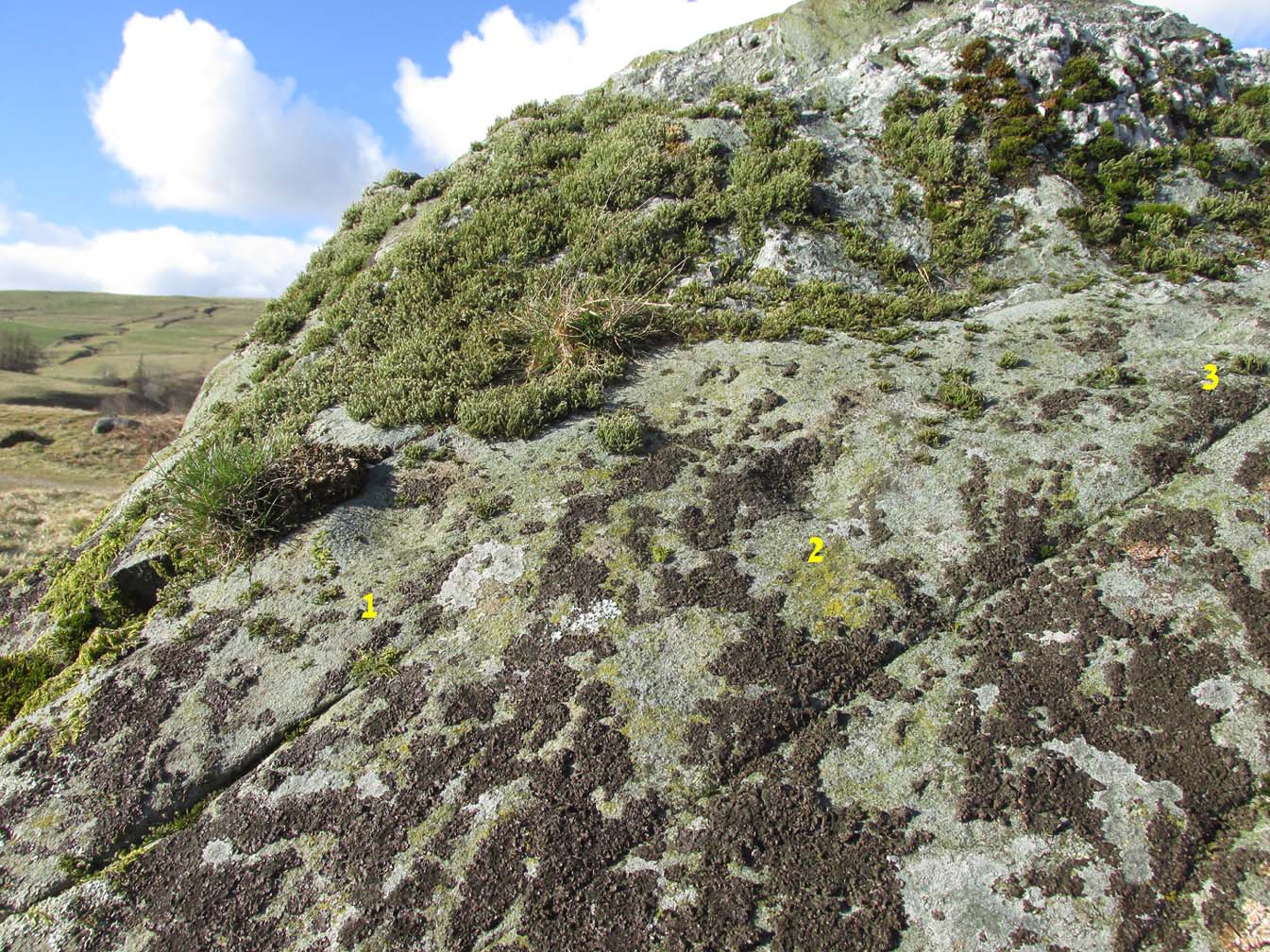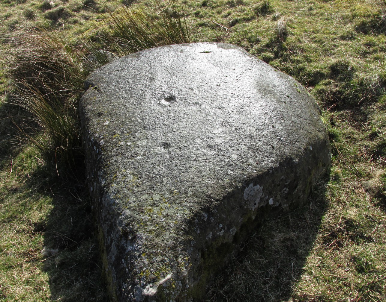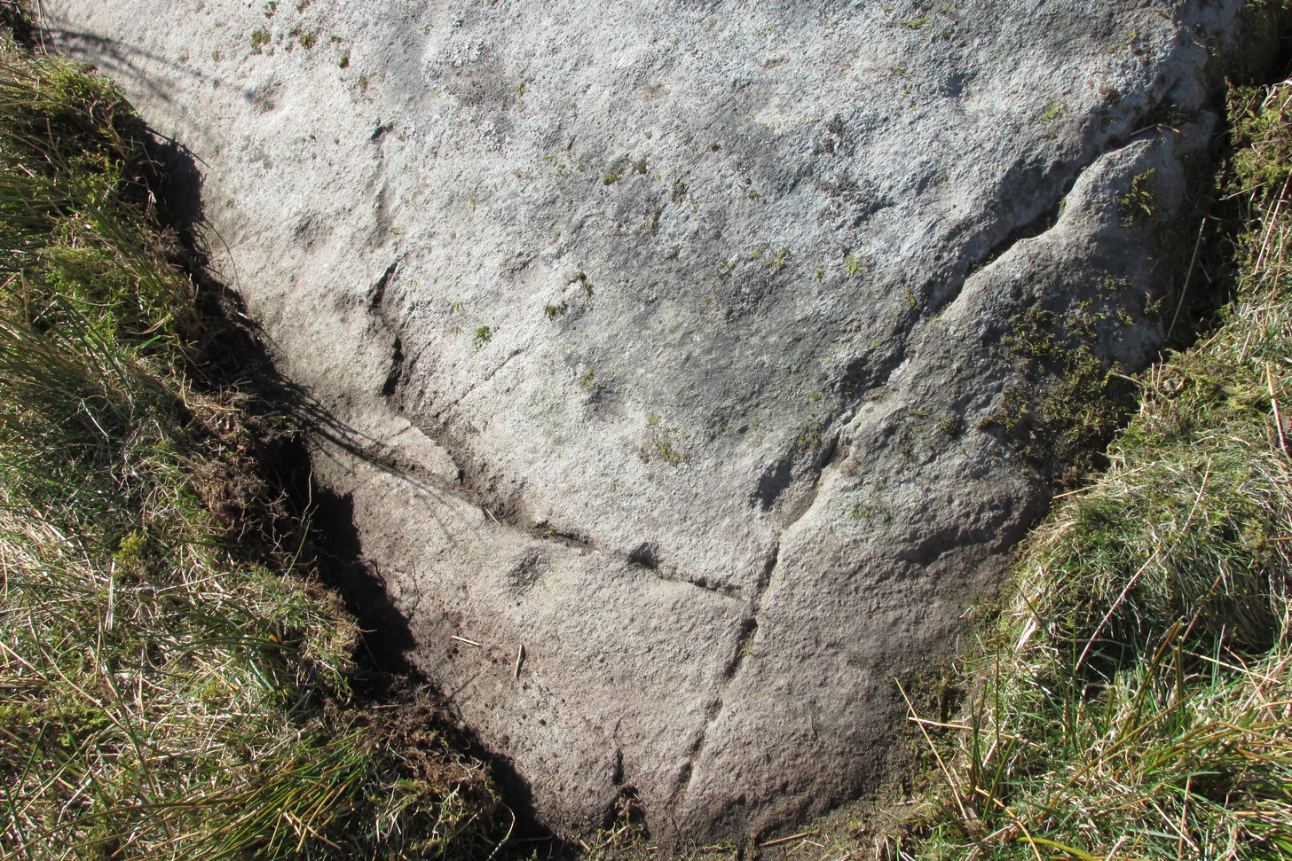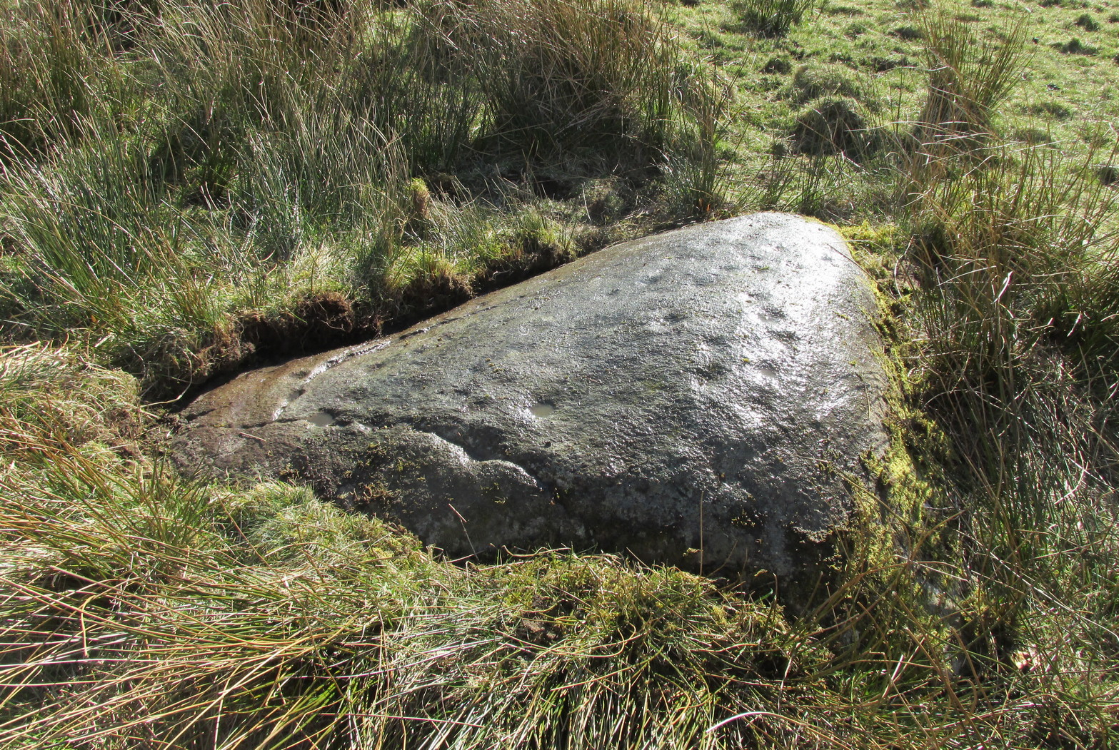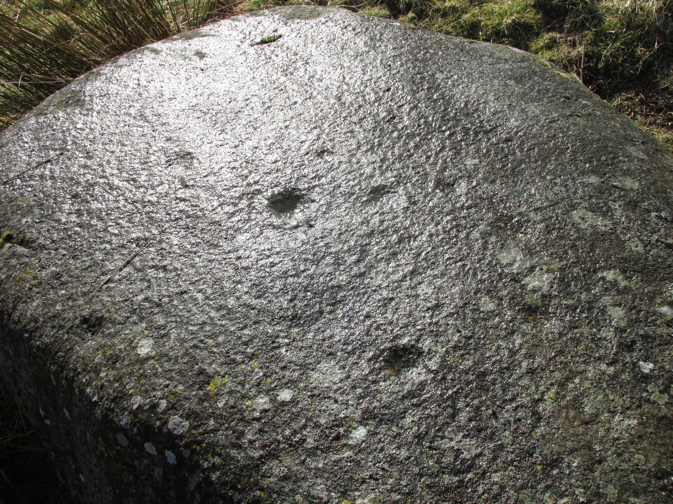 More than halfway up its south-sloping face are two very distinct cup-marks, some two inches across and up to half-inch deep: one near the western-edge and the other closer to the middle of the rock face. You can’t really miss them. They seem to be accompanied by a third about 2 feet further across to the right on its more eastern side. In formation, the three of them form a small raised arc. With the naked eye they’re very easy to make out, but were difficult to photograph due to the daylight and angle of the stone; hence in the photo here, I’ve numerated them.