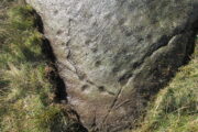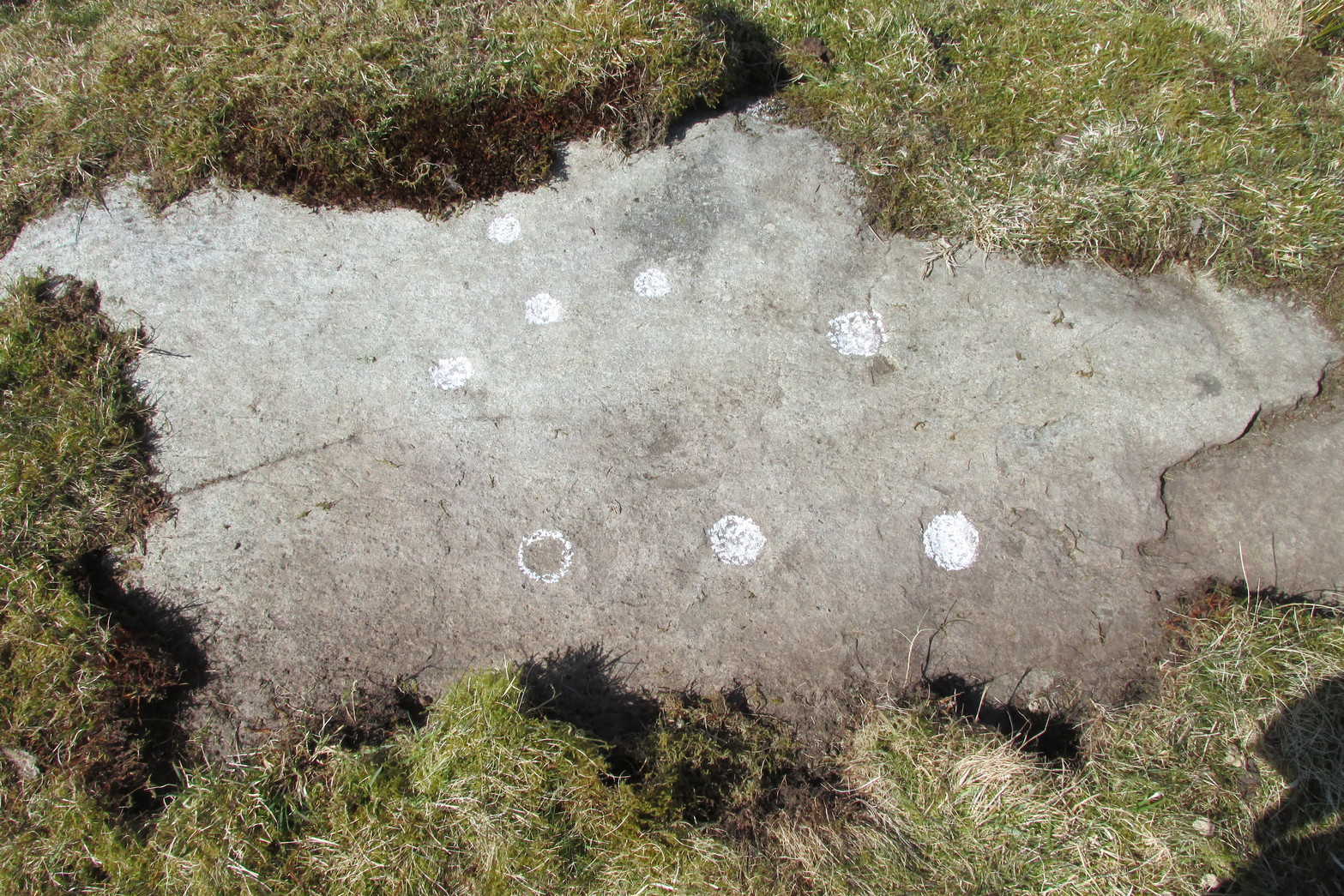 It is difficult to say with any certainty whether or not this petroglyphs has previously been reported. A somewhat confusing series of descriptions by several writers would indicate that is has not been recorded; but I’m happy to be shown otherwise… It’s nowt much to look at if truth be had. Heavily eroded by the elements, this elongated flat stone possesses seven very shallow cups, with a possible eighth, as you can see highlighted in the photo.