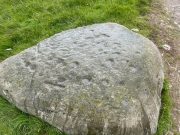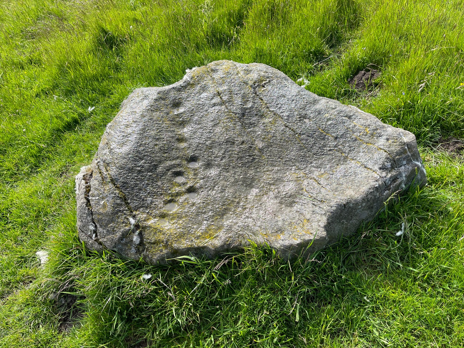“a boulder 4’10” x 3’10 x 2′ in height with 6 cups and a grooved circle, which incorporates two more cup marks on its outline. The grooved circle encloses a gapped circle with another cup mark at its centre.”